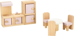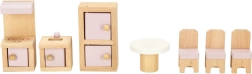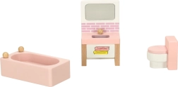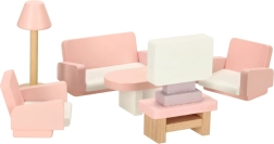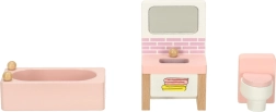 Превърнете къщата за кукли в уютен дом. Този богат комплект мебели от естествено дърво предлага всичко за цялостно обзавеждане на четири помещения: всекидневна, спалня, баня и кухня. Здравата изработка и нежните пастелни цветове създават хармонична среда за всекидневна игра.