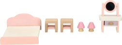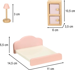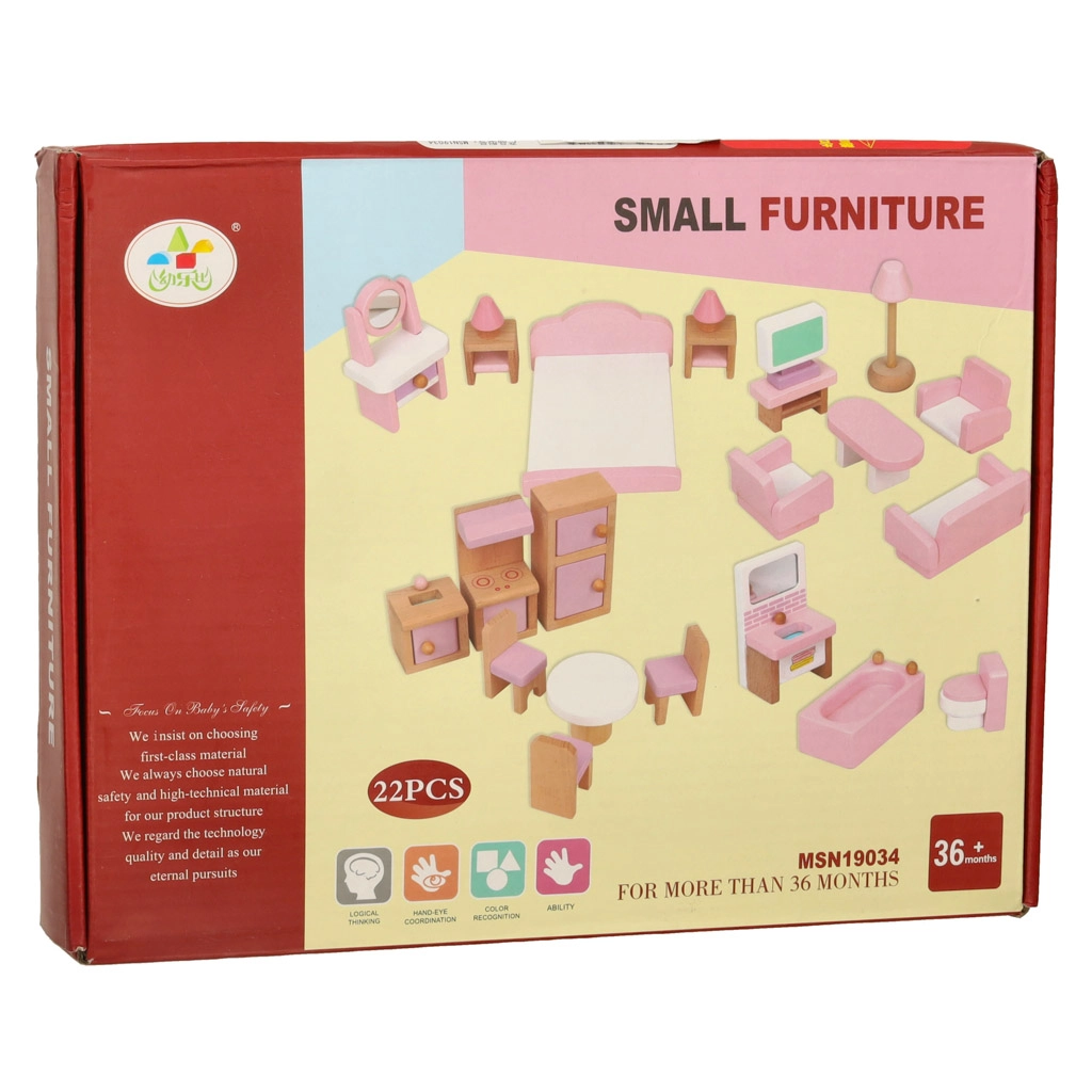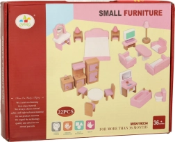 Стилен комплект дървени мебели за къща за кукли оборудва всекидневна, спалня, баня и кухня. Качествено естествено дърво, безопасни бои в розово и бяло, общо 22 части. Подкрепя креативността, пространственото мислене и ученето чрез игра още от 3 години.