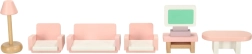 Диван, 2 кресла, холна масичка, лампа и телевизор създават уютна всекидневна. Идеален за измисляне на истории и трениране на социални умения.
