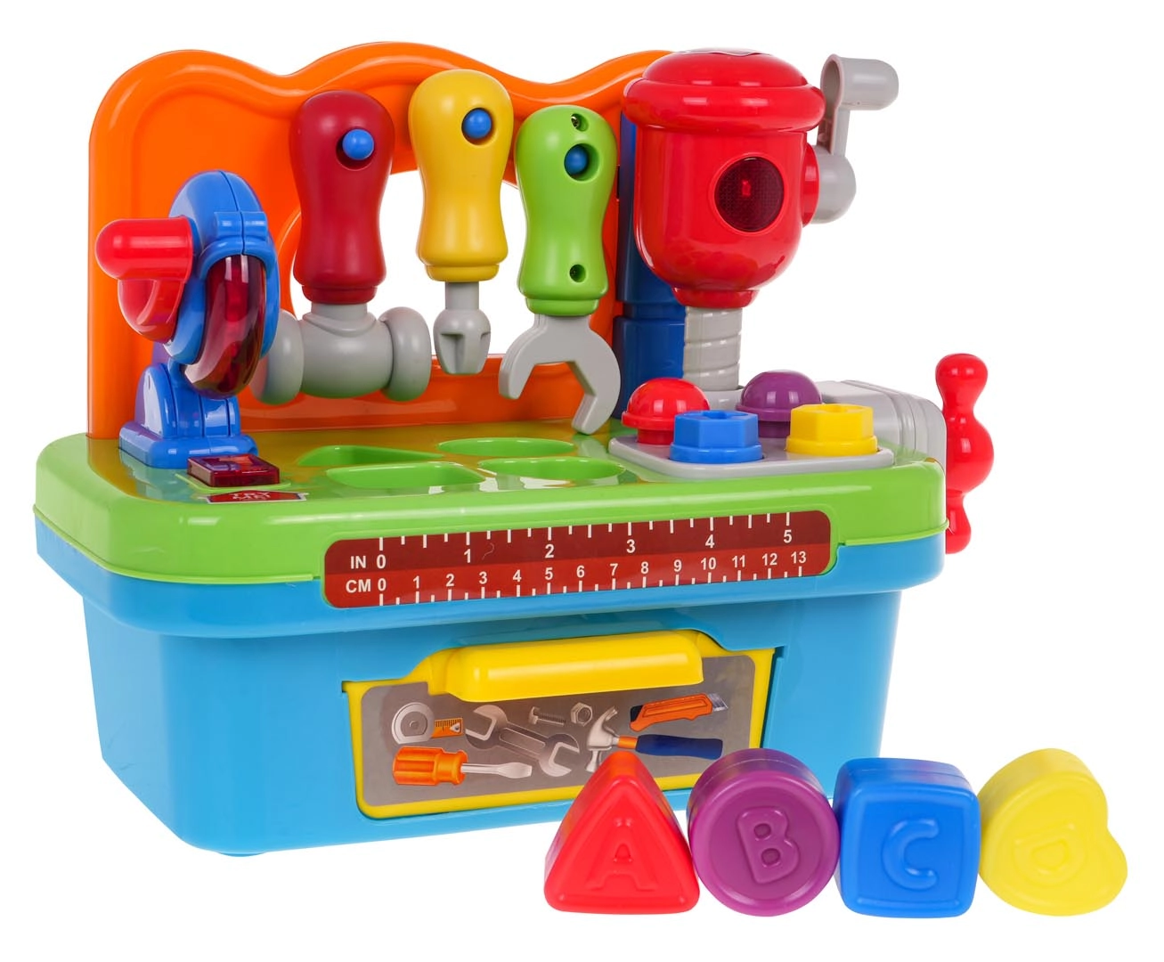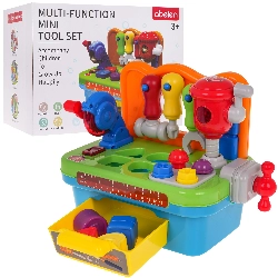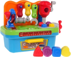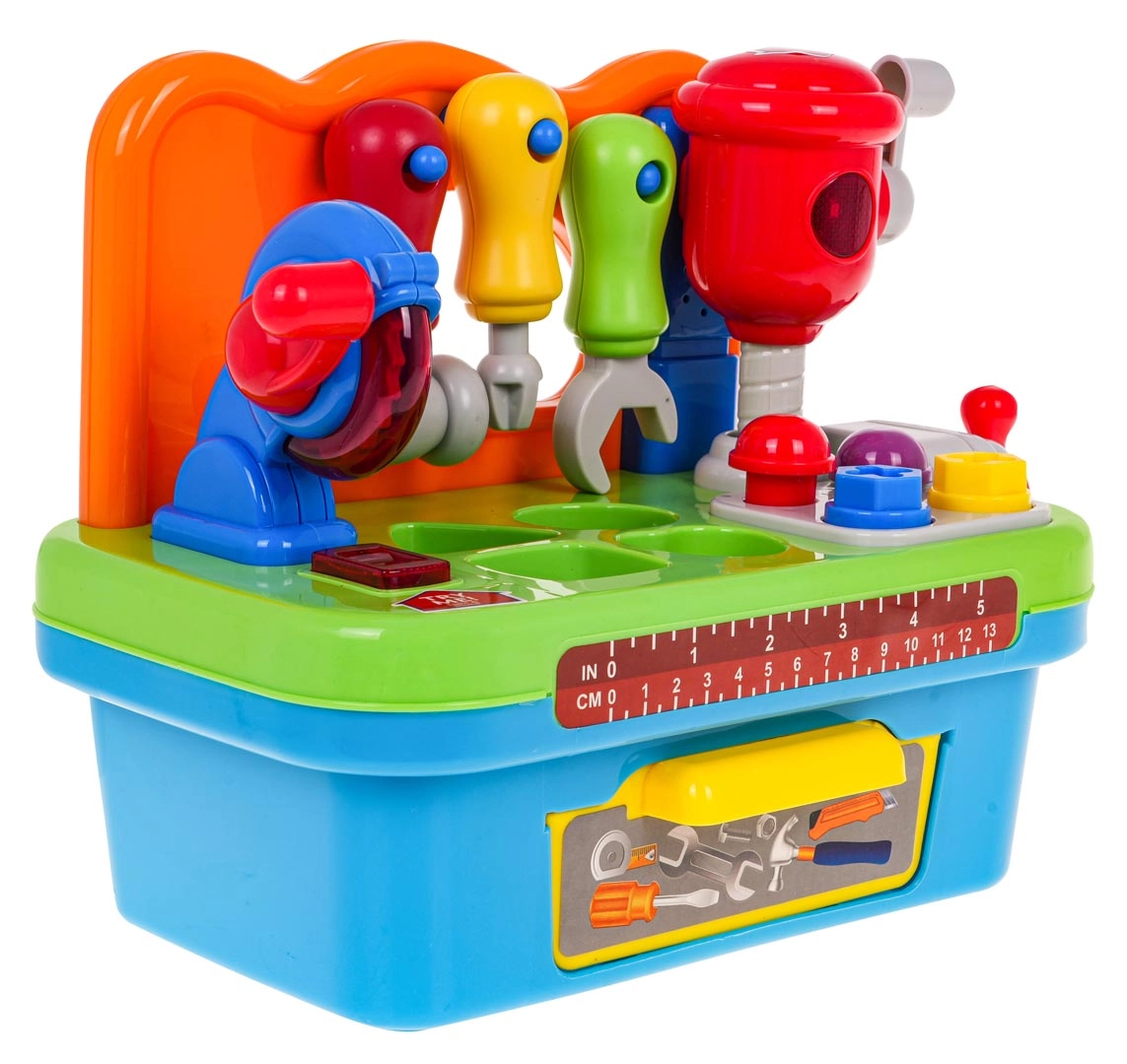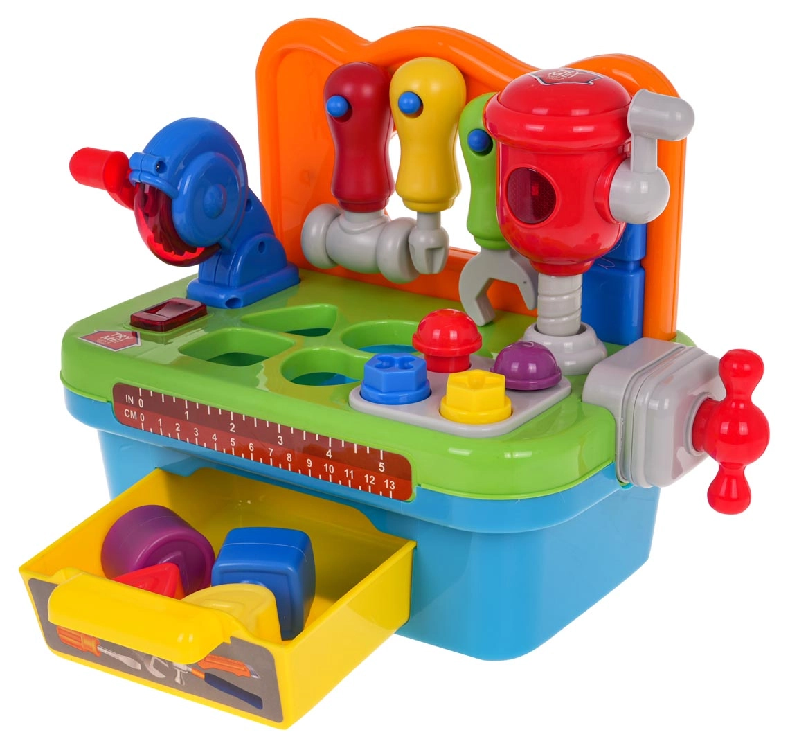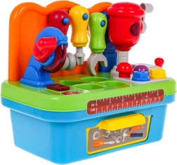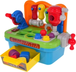 Тази многофункционална интерактивна работилница е идеална за малки майстори. Подпомага развитието на моторните умения и насърчава активната игра. Работилницата включва различни инструменти, съобразени с малките детски ръчички, като отвертка, ключ и чукче, които могат да се окачат на полица. На работния плот ще намерите дисков трион с реалистични звукови и светлинни ефекти, както и подвижен ударен чук.