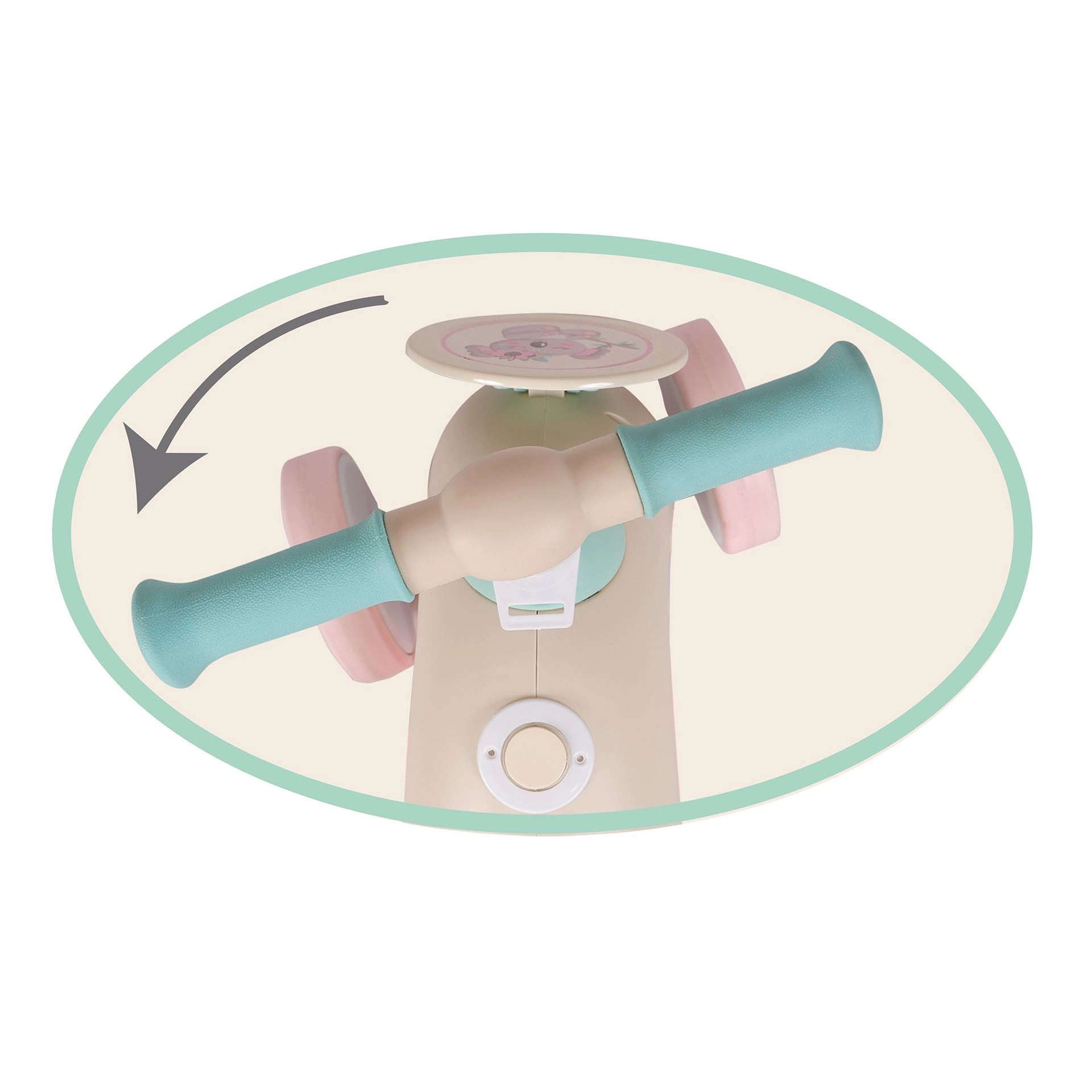 Въртящото се кормило с предпазна система предотвратява прищипване на пръстите и нежелано превъртане. Гумираните ръкохватки се държат удобно дори от малки ръчички.