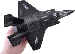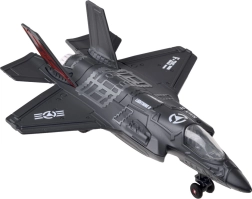 Открийте детайлен метален модел на военен самолет F-25, който съчетава издръжлива изработка с атрактивни функции за деца от 3 години. След издърпване назад благодарение на механизма pull-back се движи напред. При притискане към повърхността се активират звуци на двигател и стрелба, а в кабината се включва LED осветление, което повишава реалистичността на играта.