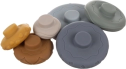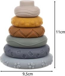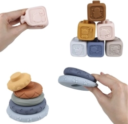 Налични са 6 меки кубчета и рингове, които издават нежни звуци и имат различни текстури, което подпомага развитието на сетивата и моторните умения.