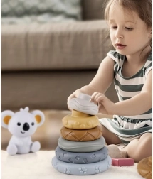 Освен 13 сензорни елемента и кубчета, комплектът включва и сладка играчка във форма на коала, която може да се поставя върху кубчетата за още по-забавна игра. Всеки елемент от комплекта е проектиран да предоставя на детето разнообразни сензорни и звукови стимули благодарение на релефните шарки и деликатните звуци, които кубчетата издават при манипулация.