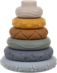 Комплектът включва различни рингове и кубчета за строене и подреждане, което развива детското творческо и логическо мислене.