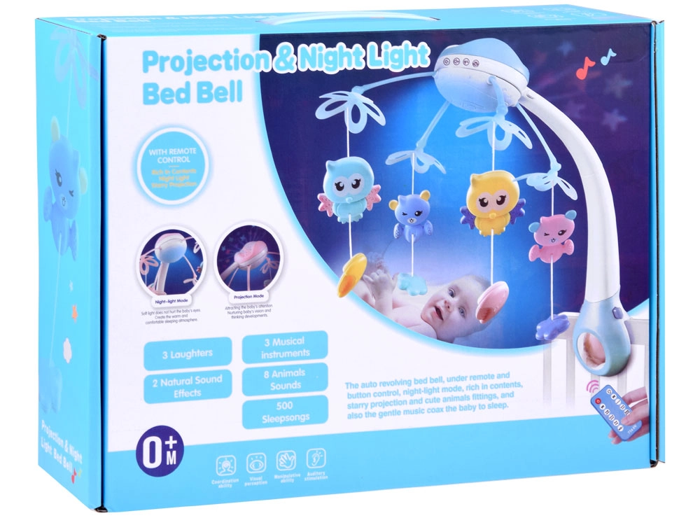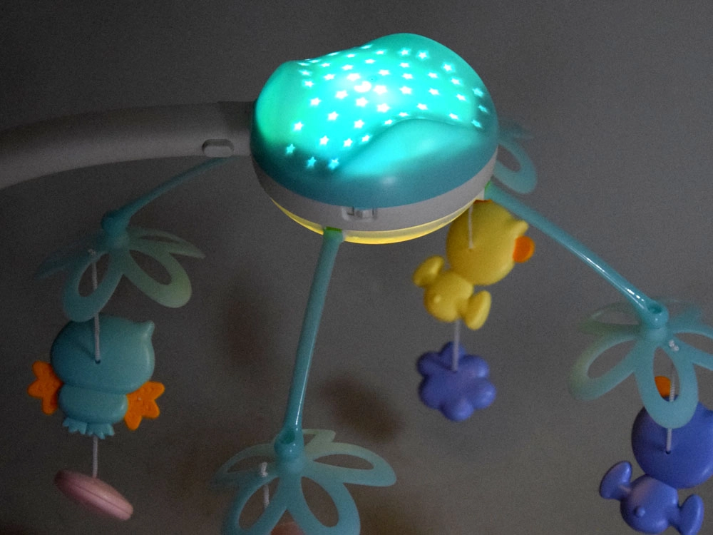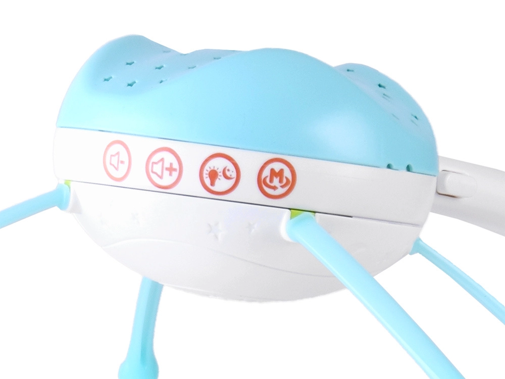 Мобилът е проектиран да подпомага успокояването и сетивното развитие още от раждането. Вграденият проектор прожектира върху тавана и стените нежни звездички, докато вградената музикална кутия възпроизвежда мелодии, приспивни песни, звуци от природата и животни. Благодарение на дистанционното управление можете да включите или да намалите звука на мобила дори от съседната стая.