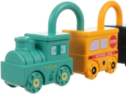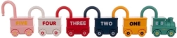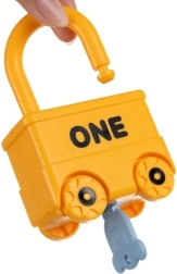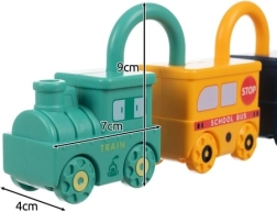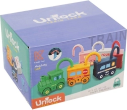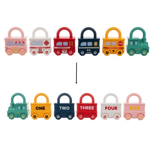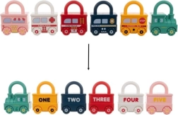 Тази умна обучителна играчка съчетава забавление със смислено учене. Всяко превозно средство е катинар и към всяко принадлежи един ключ във форма на мече с щампирано число 0–5. Детето естествено тренира фината моторика, логическото мислене и разпознаването на числата. Горната част на катинара може да се върти на 360°, а при правилно отключване превозните средства се свързват лесно в дълго влакче.