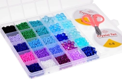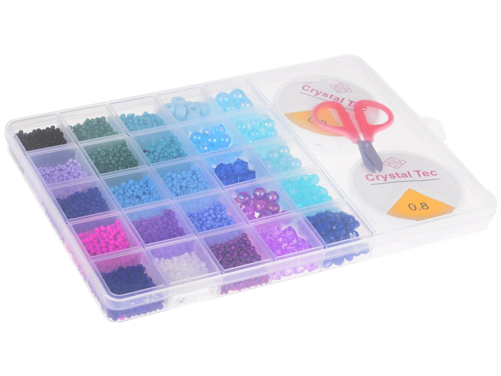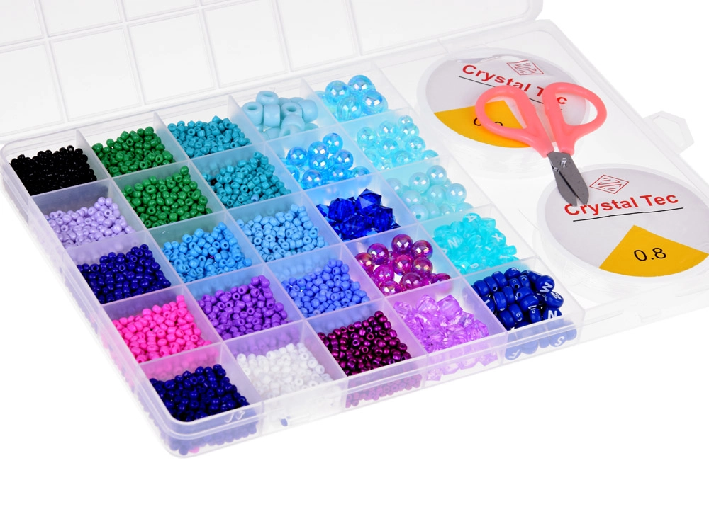 Комплектът е опакован в практична, прозрачна кутия тип куфарче с прегради, които предотвратяват смесването на мънистата. Включени са също 2 шпули прозрачна корда и ножички, което ви позволява да започнете веднага с изработката на мечтаните бижута.