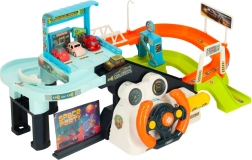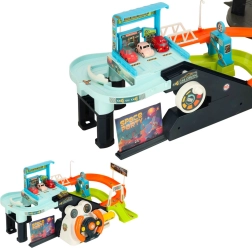 Комплектът включва волан, който позволява на децата да се почувстват сякаш са зад волана на истинска кола, с три бутона за стартиране на звукови ефекти, които правят играта още по-интересна. Воланът също активира един от двата асансьора, благодарение на които количките се изкачват на върха на пистата.