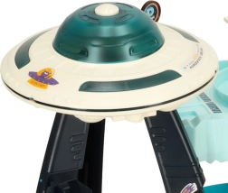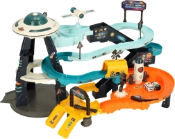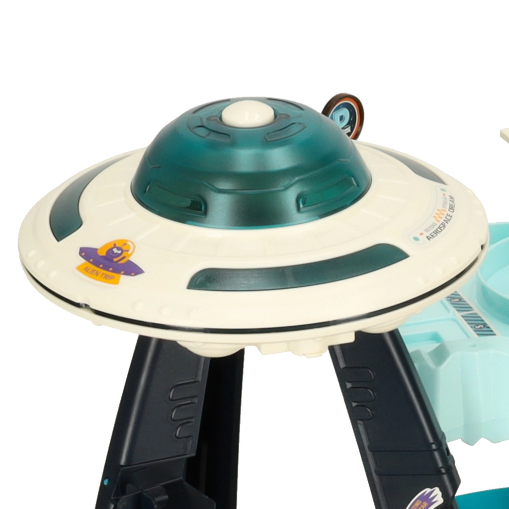 Футуристичната кула НЛО е центърът на трасето; при включване свети и издава звуци, което подсилва атмосферата на космическата сцена. Този комплект не само забавлява, но и развива моторните умения, координацията и въображението на децата, отвеждайки ги в завладяващ свят, пълен с приключения!