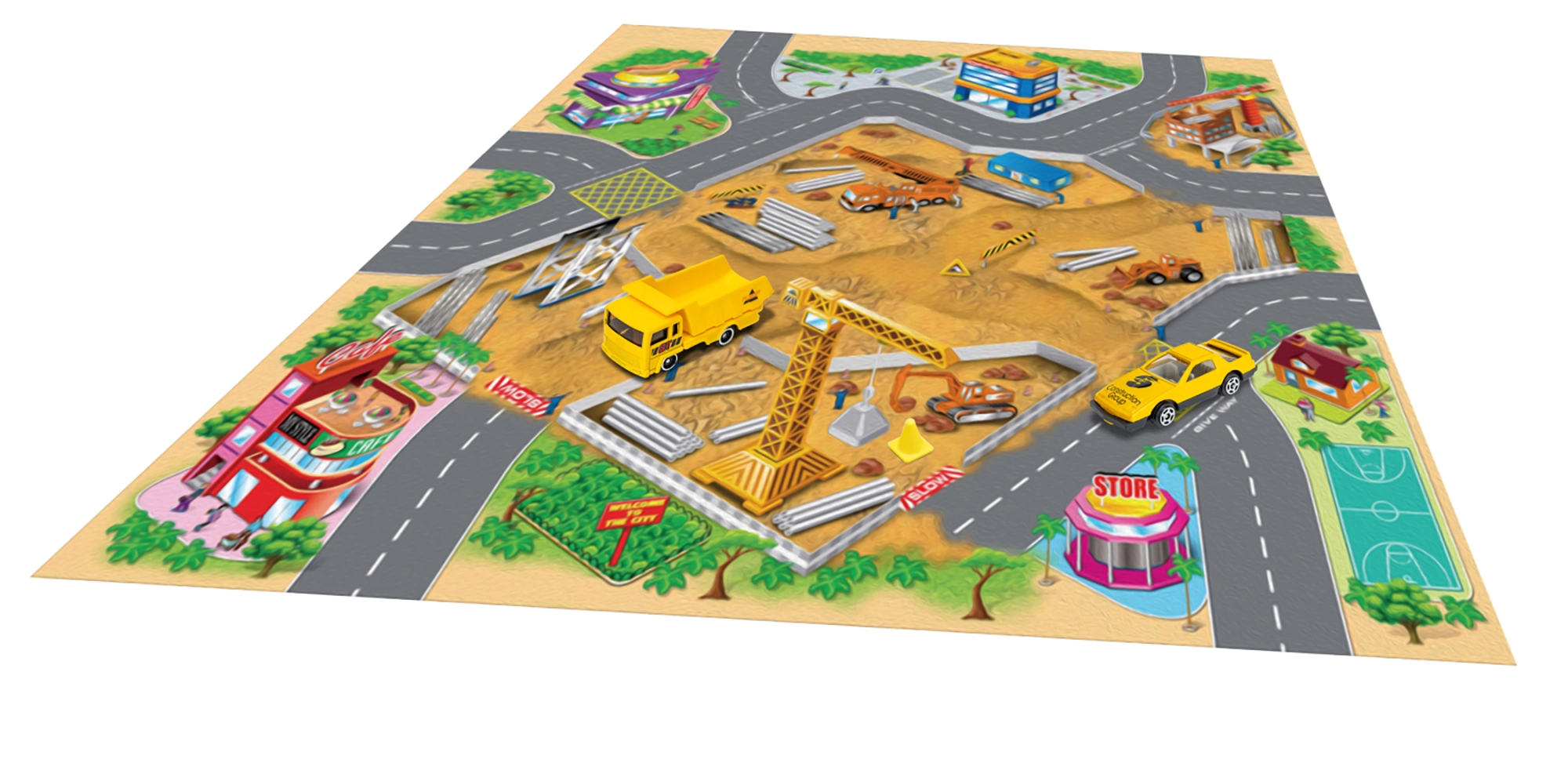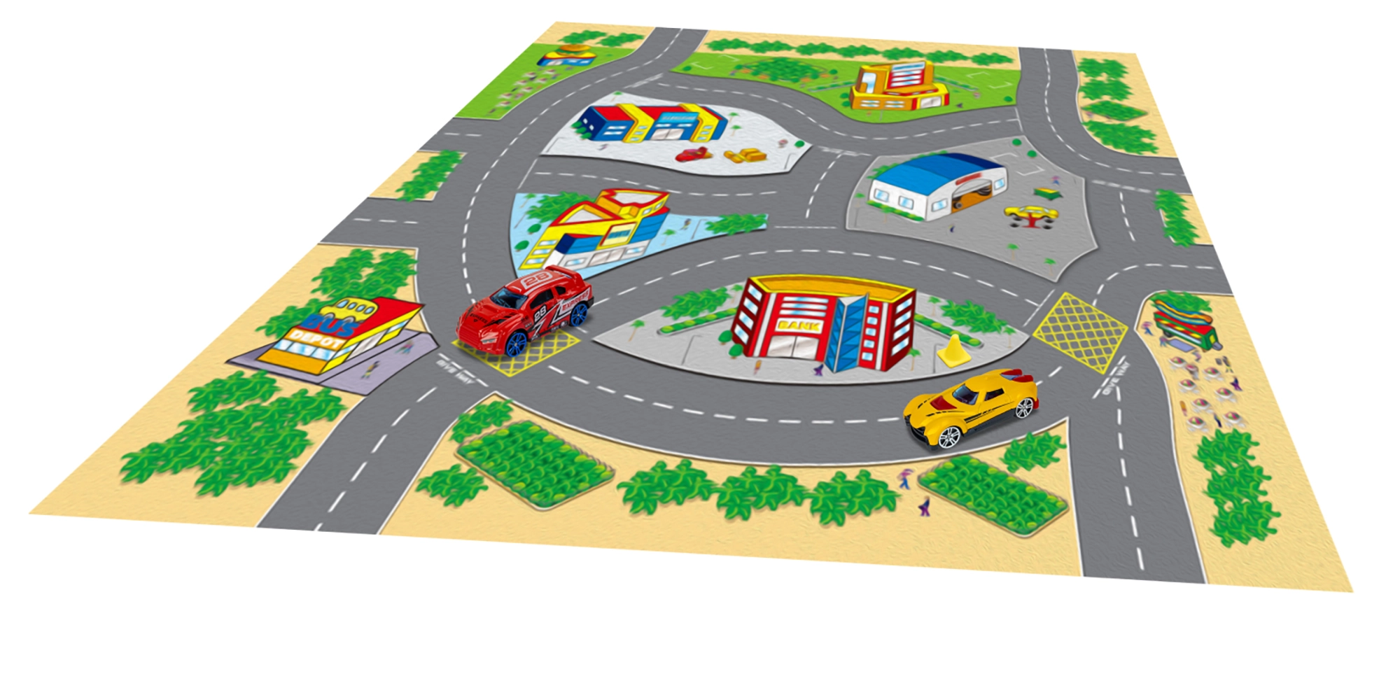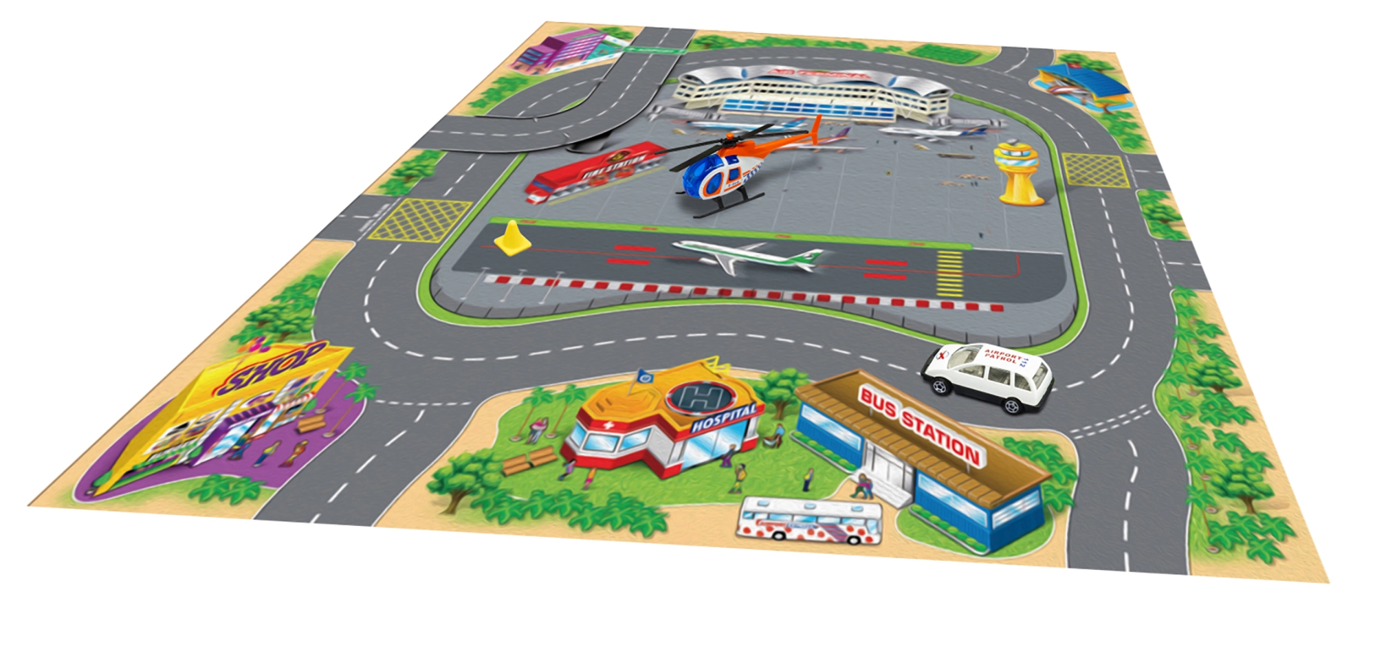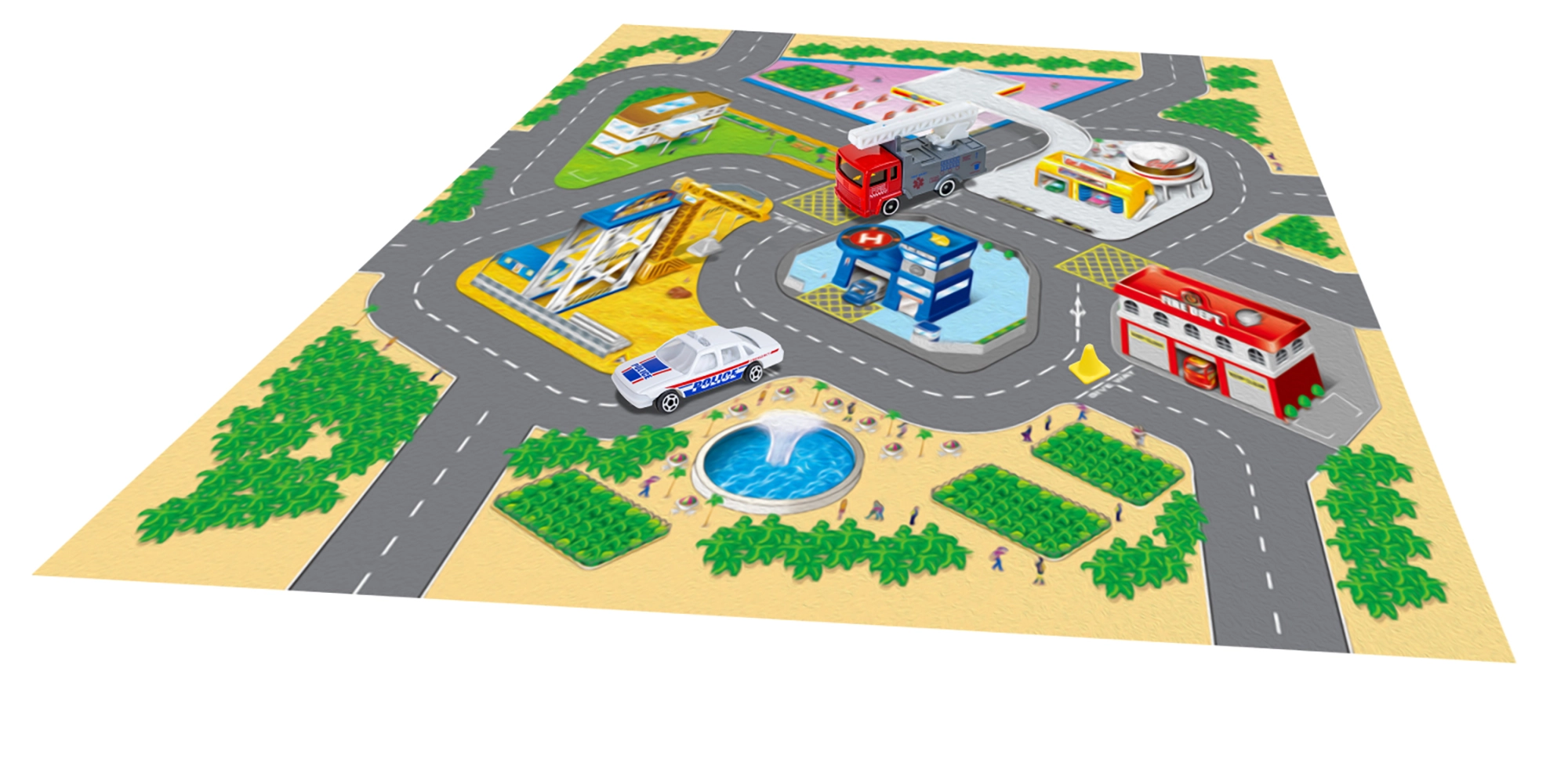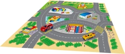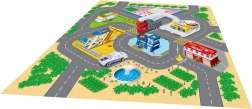Тази игрална карта предлага на децата пъстър свят от истории и приключения. Текстилната изработка е приятна на допир, лесно се сгъва и прибира, докато металните превозни средства впечатляват с издръжливост и реалистична изработка. Благодарение на компактните размери комплектът е идеален за дома, детската градина и пътувания.