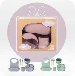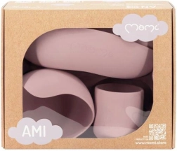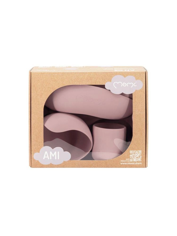 Комплектът MoMi Ami е създаден за удобно и безопасно първо хранене. Повдигнатите ръбове и триделната чиния улесняват загребването и разделянето на порциите, докато силните вендузи на купата и чинията държат съдовете стабилно на масата или подноса на столчето за хранене. Чашката 180 мл и купата 360 мл имат идеален размер за ежедневна употреба.