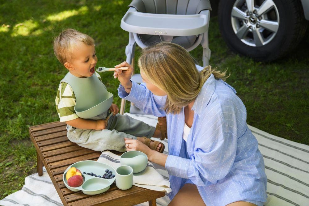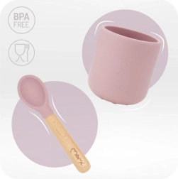 Приборите за хранене са изработени от мек силикон, безопасен за контакт с храни и са без BPA и фталати. Силиконовите части могат да се мият в съдомиялна и да се ползват в микровълнова. Дървените дръжки на приборите са ергономични и приятни за детската ръка. Включен е и комфортен лигавник с дълбок джоб, който улавя трохи и капки.