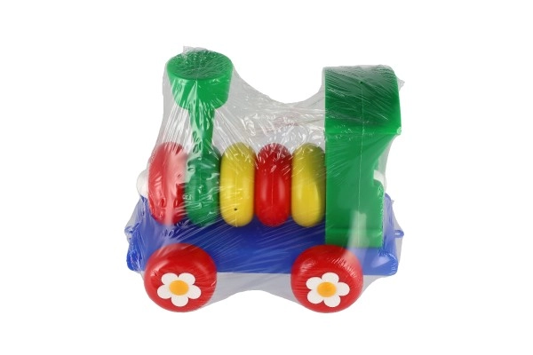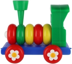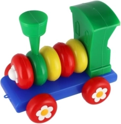 Влакчето е изработено от пластмаса в ярки цветове, които привличат вниманието на децата, и е украсено с флорални мотиви върху колелата.