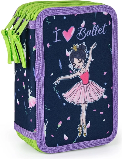 Елегантен трипластов несесер с мотив на балерина, идеален за ученици. Предлага 40 ластични държача за подредено съхранение на писали и ученически принадлежности, здрав цип с големи дърпачи за лесно отваряне и прозрачен джоб за седмично график-разписание.