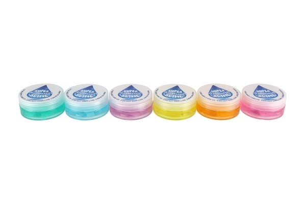 Открийте завладяващи цветови миксове, които всяка кутийка слайм предлага – зелено, синьо, лилаво, жълто, оранжево и розово.