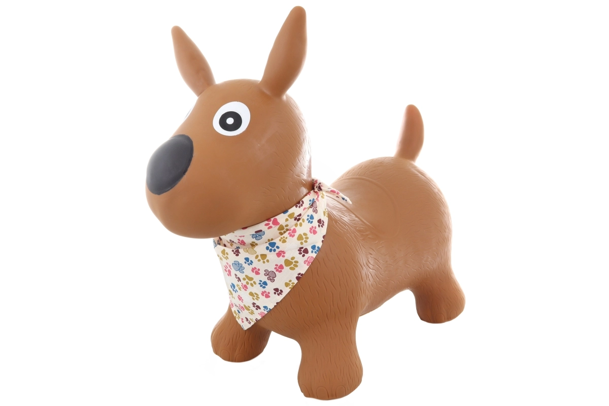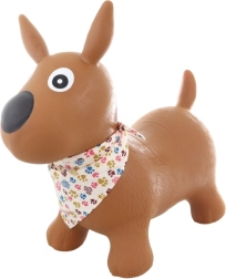 Очарователно гумено скачащо животинче във форма на кученце с шалче ще зарадва всяко дете от 1 годинка. Осигурява стабилно сядане, лесно захващане и забавна двигателна тренировка. Максимално натоварване 50 кг, удобна височина на седалката 24 см и практична помпичка в комплекта за бързо надуване.