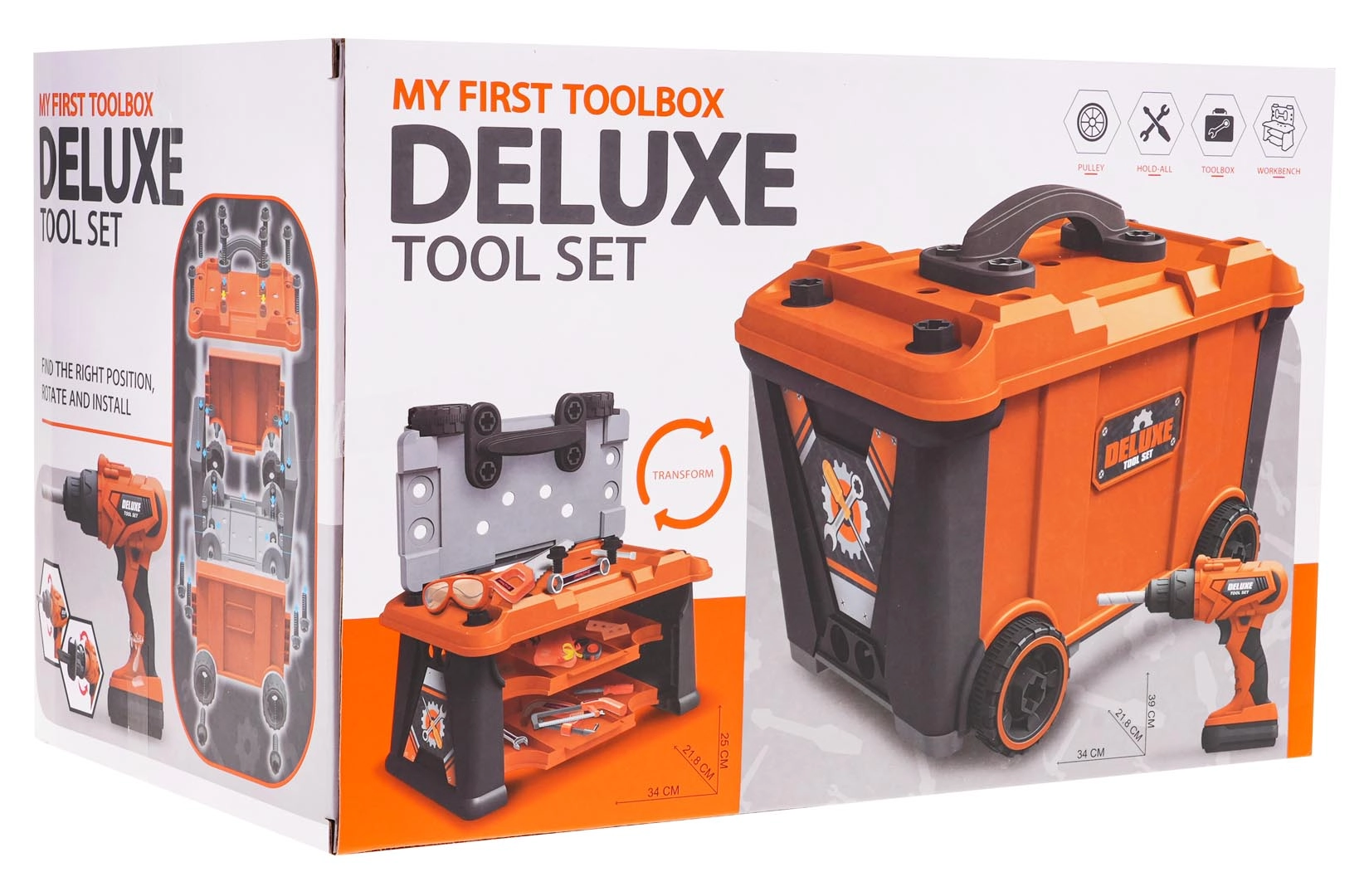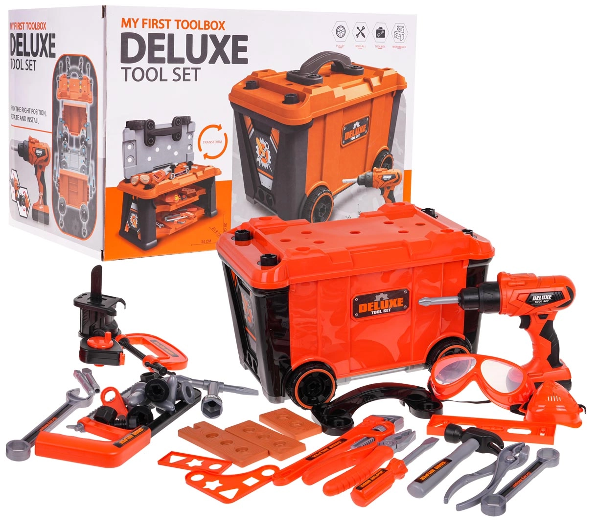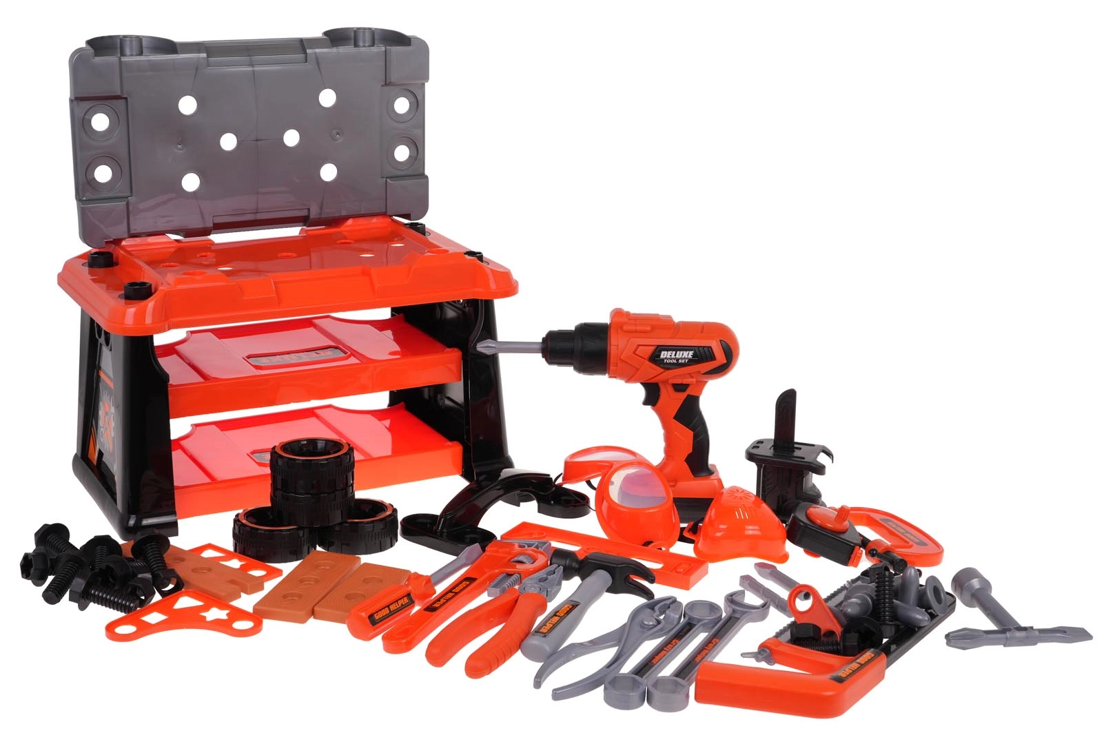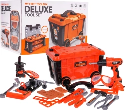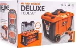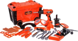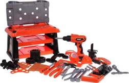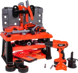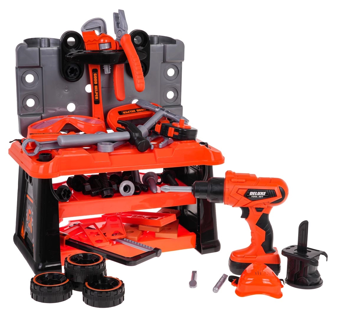 Този богато оборудван комплект предлага на децата реалистично изживяване от работа в работилница. Лесно се сглобява стабилен работен плот, а след игра всичко се прибира в преносим куфар на колелца. Основната звезда е батрийната бормашина/отвертка със сменяеми битове и накрайник с трион, която може да завинтва и развинтва – съвсем като истинска.