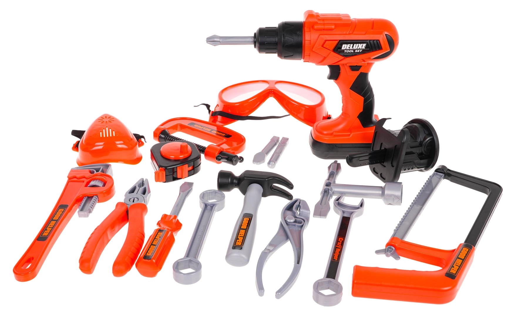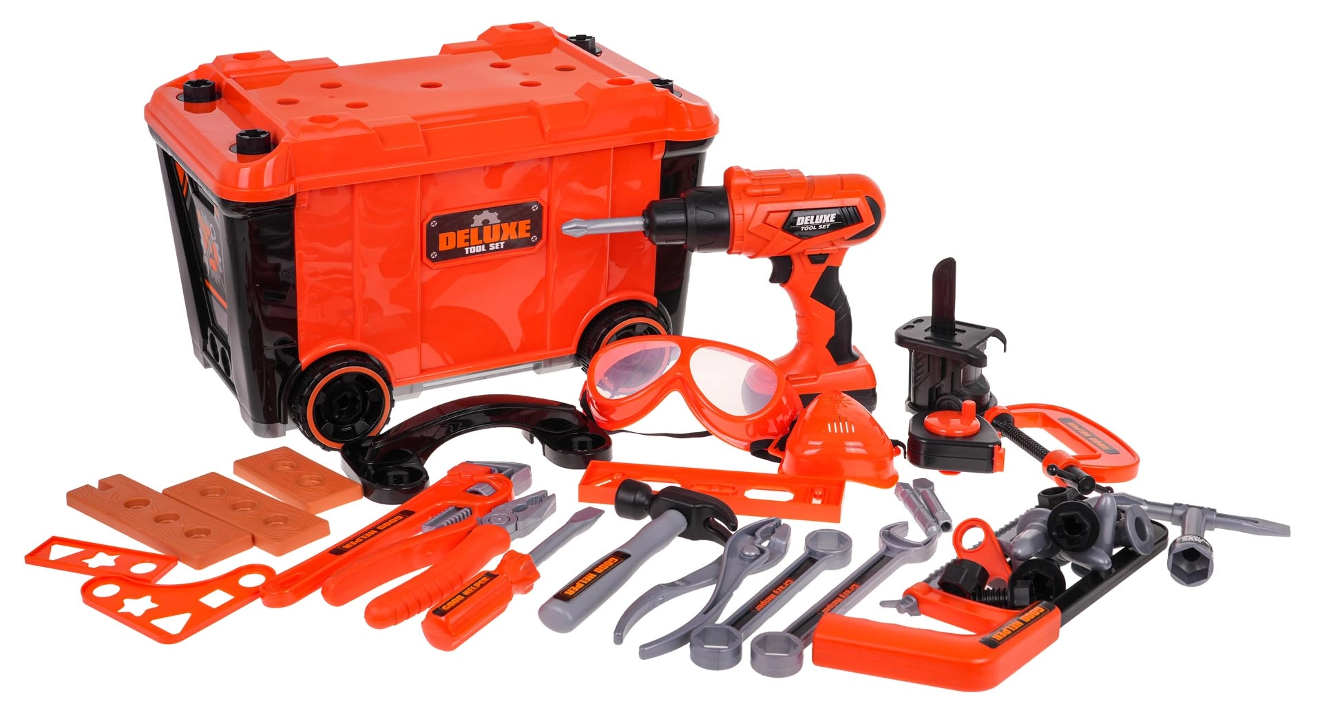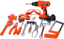 Чук, триончета, отвертки, ключове, клещи, предпазни очила, метър, винтове, гайки и колчета – всичко за изобретателно строене и учене чрез игра.
