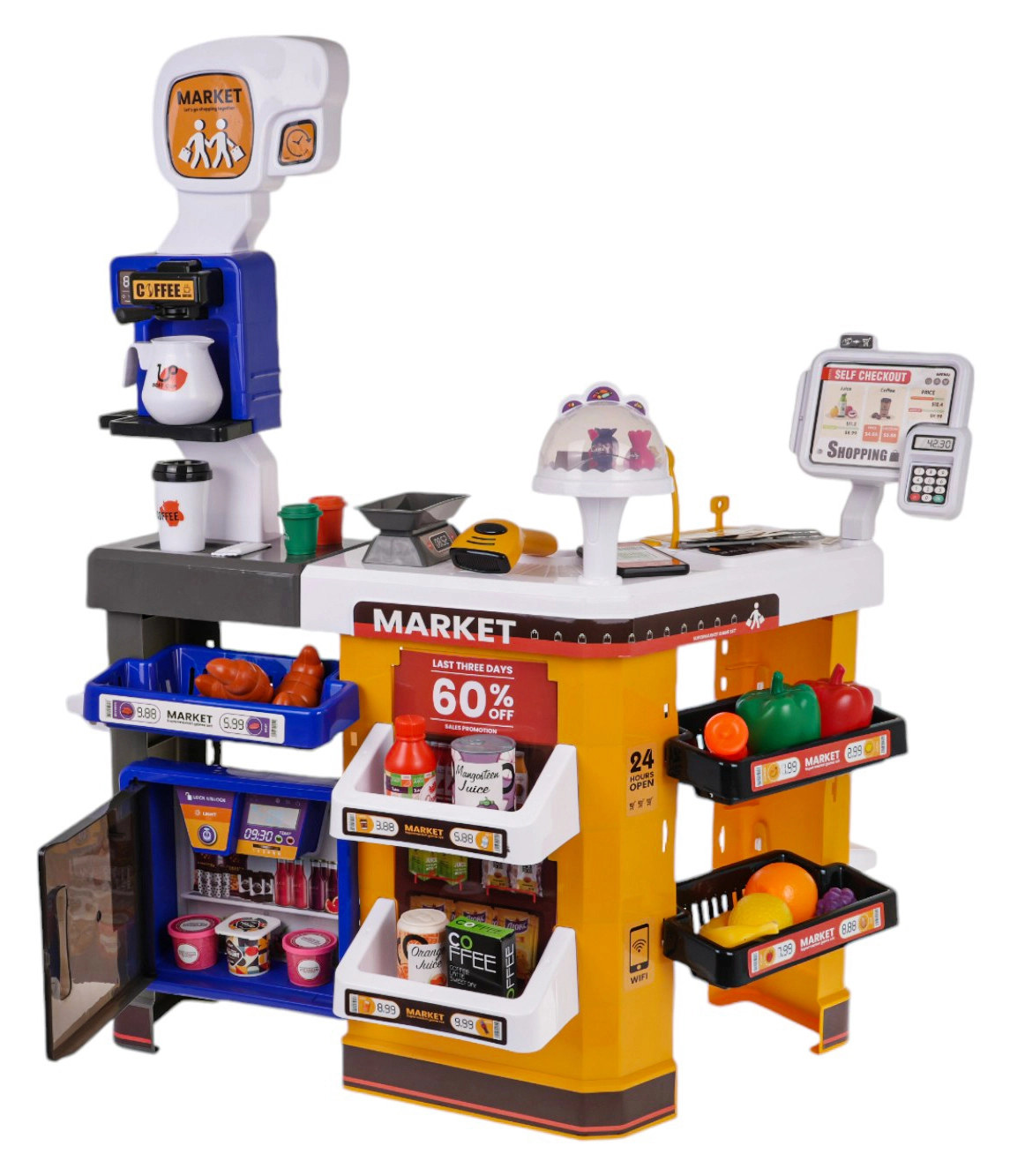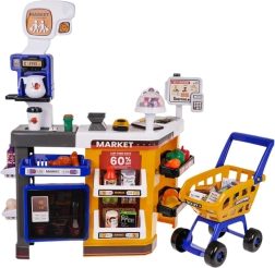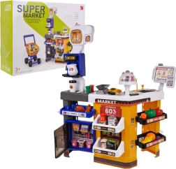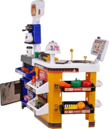 Този детайлен детски супермаркет превръща стаята в истински магазин. Сетът включва каса с четец на карти, скенер, микрофон, везна, отварящ се хладилник, рафтове и много реалистични макети на храни. Благодарение на светлинните и звукови ефекти играта е още по-забавна и подпомага въображението и социалните умения.