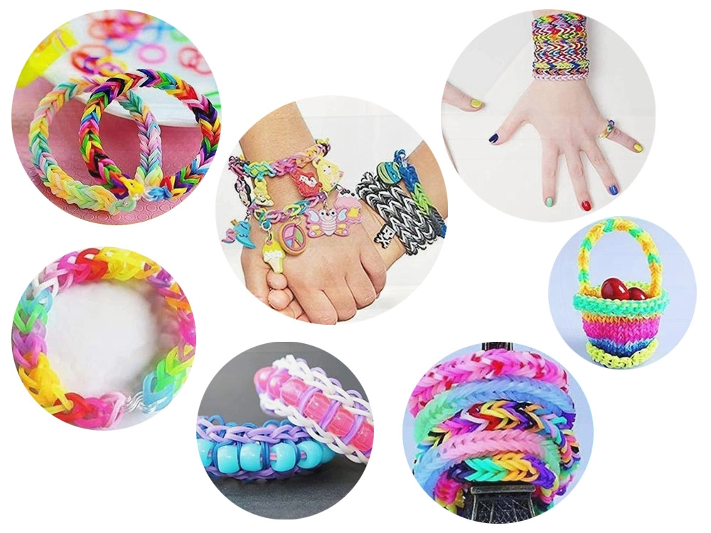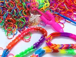- около 4500 бр. ластици, прозрачни свързващи кукички, цветни/пастелни мъниста, 6× малки кукички, 1× голяма кука, 2× прашка, 2× стан, 6× силиконова висулка, прозрачен органайзер с отделения