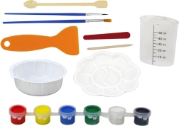 Шест цвята, палитра, четки, шпатула, купичка, мерителна чаша и шлайф инструмент – децата могат да започнат веднага и да пробват различни техники на смесване и рисуване.