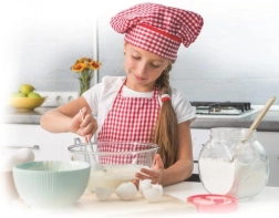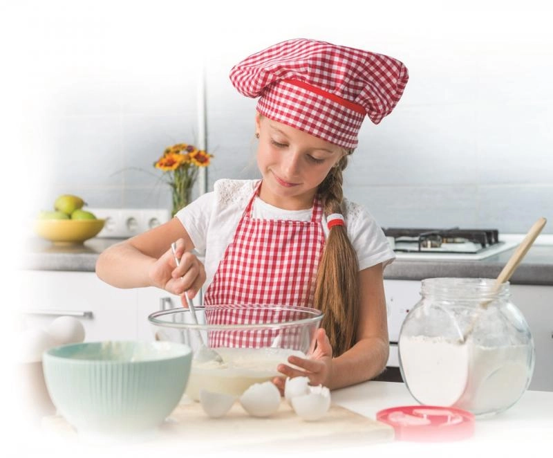 Момиче в кухнята, което по забавен начин учи децата на основите на печенето и готвенето.