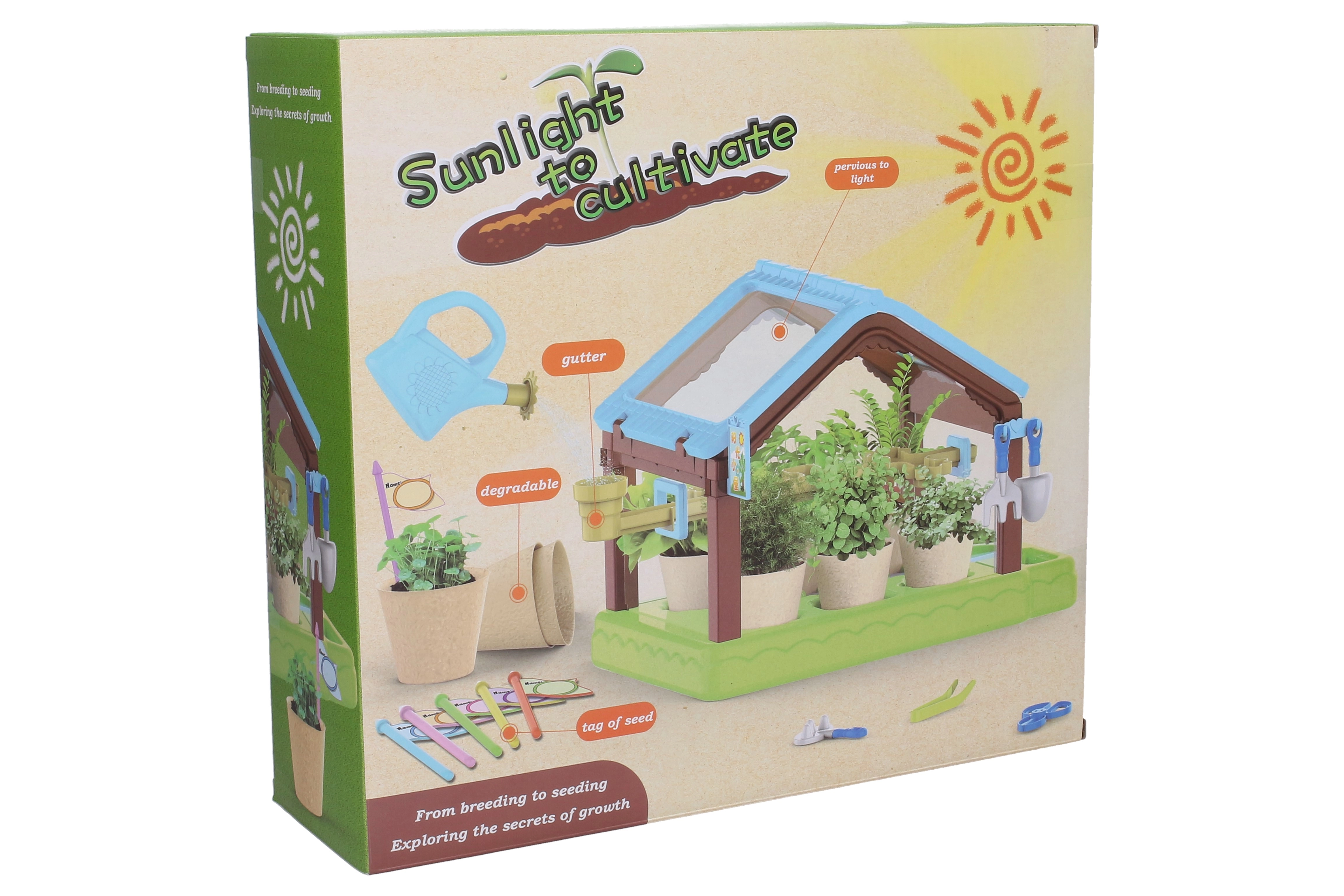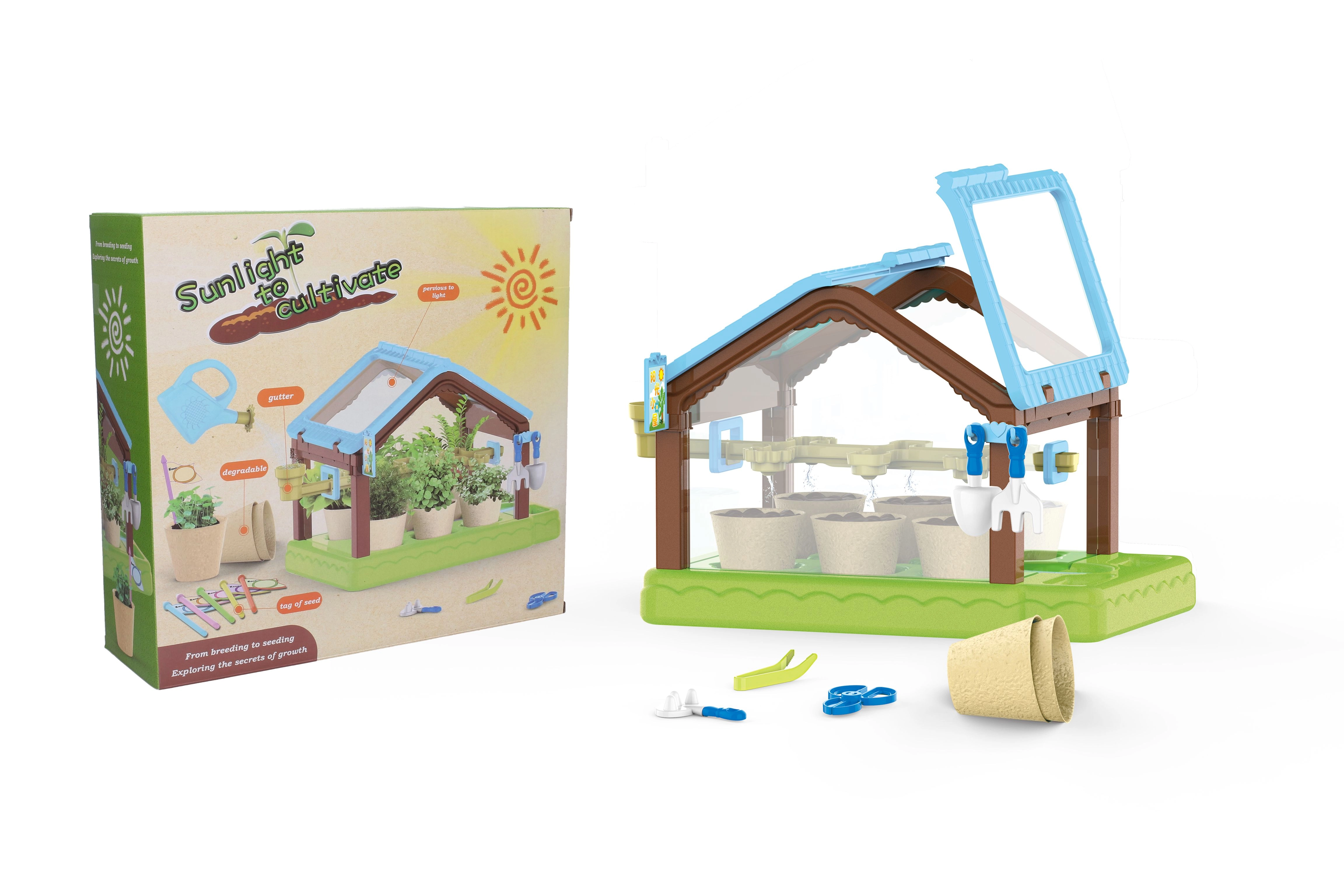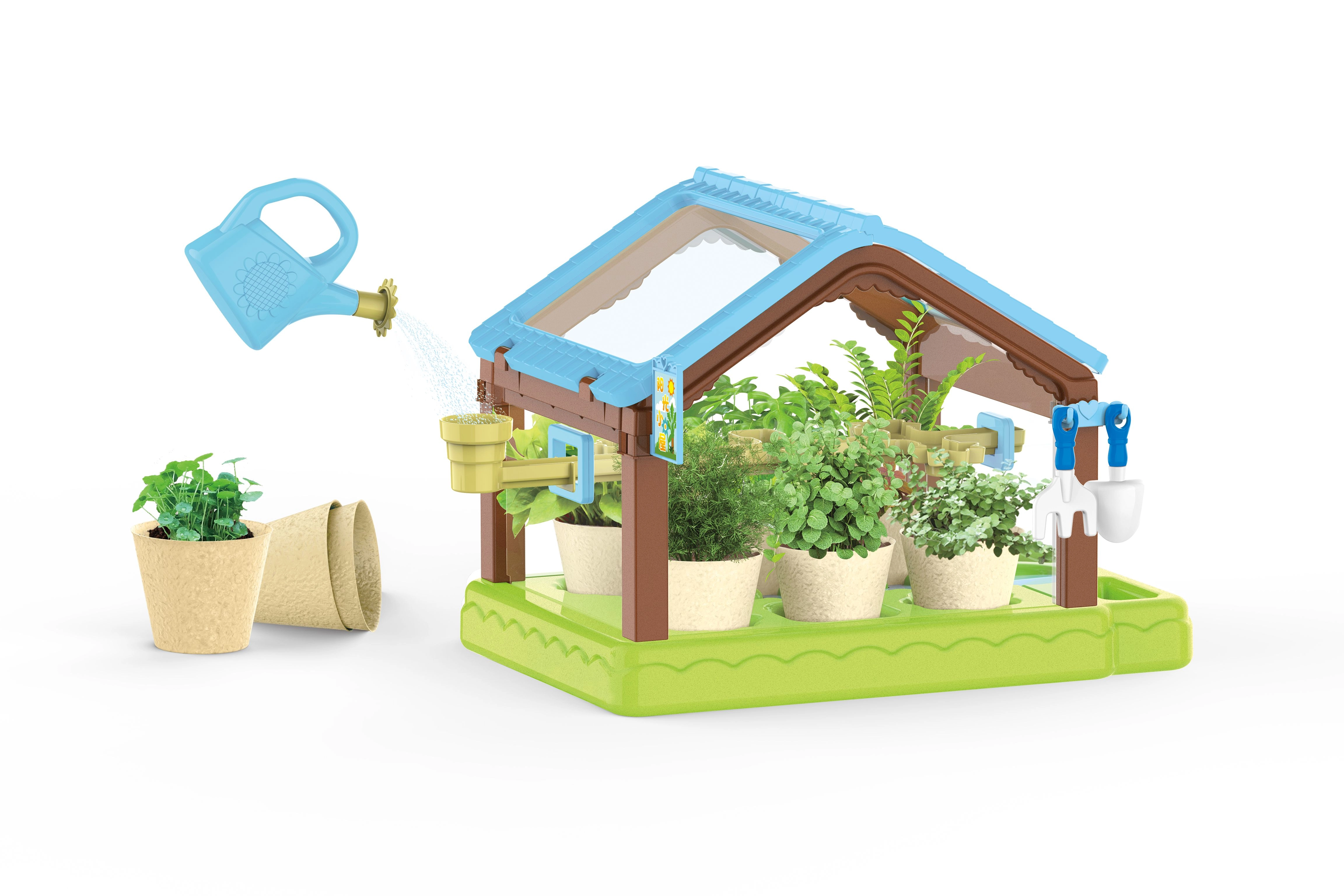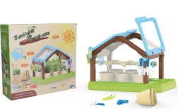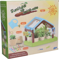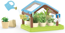 - парник, 6 саксии, 4x почва, семена, 6 етикета, лейка, пинсета, ножички, лопатка, греблички, маркер за дупки