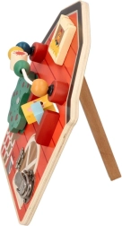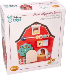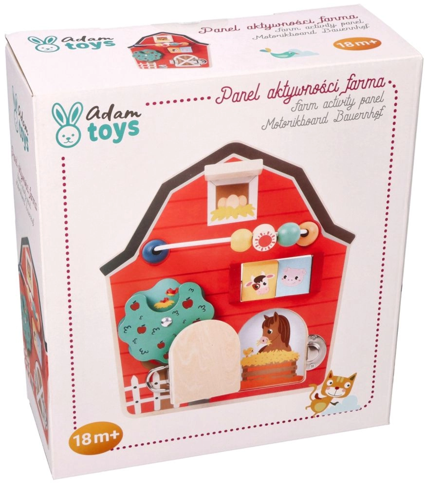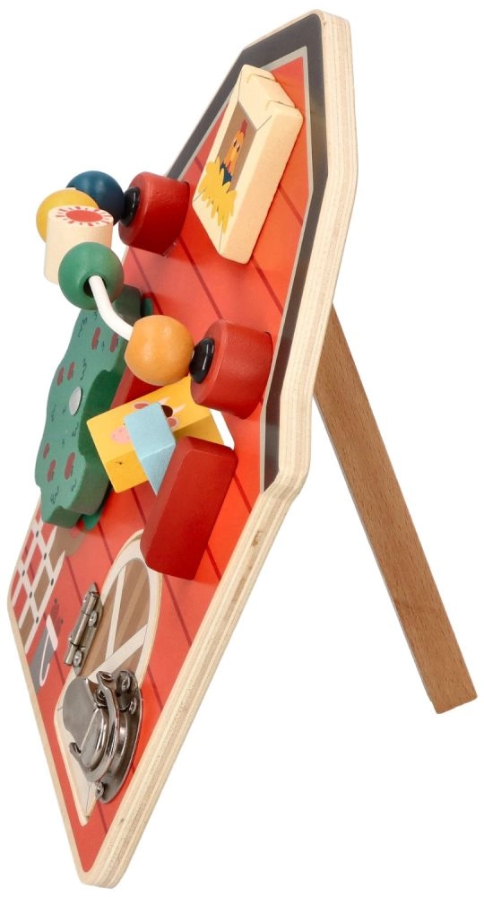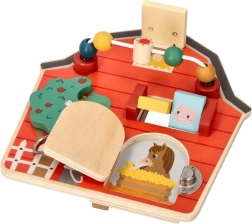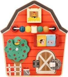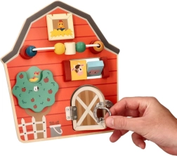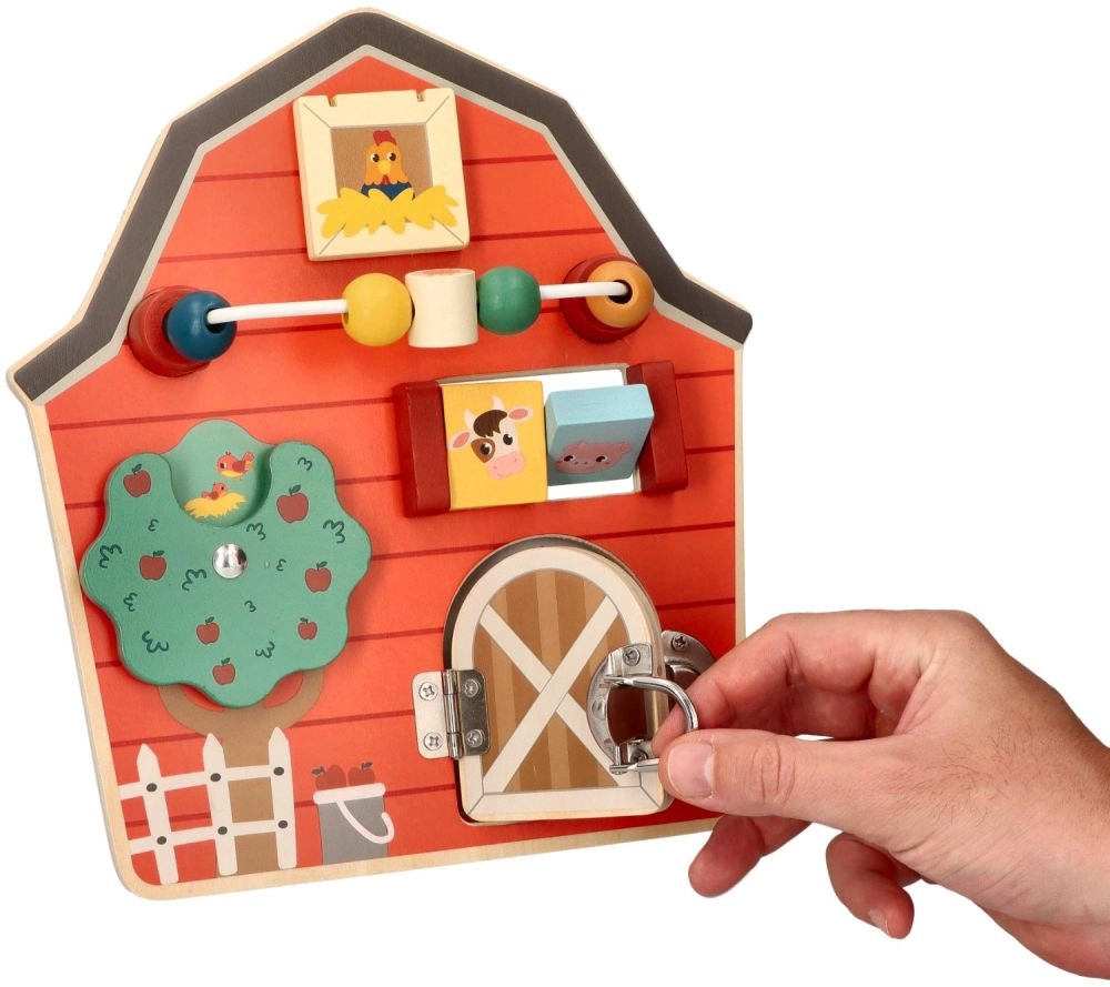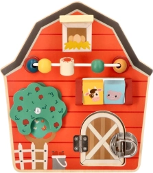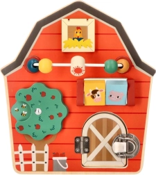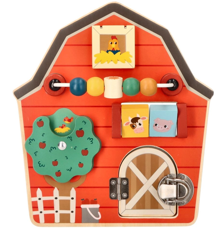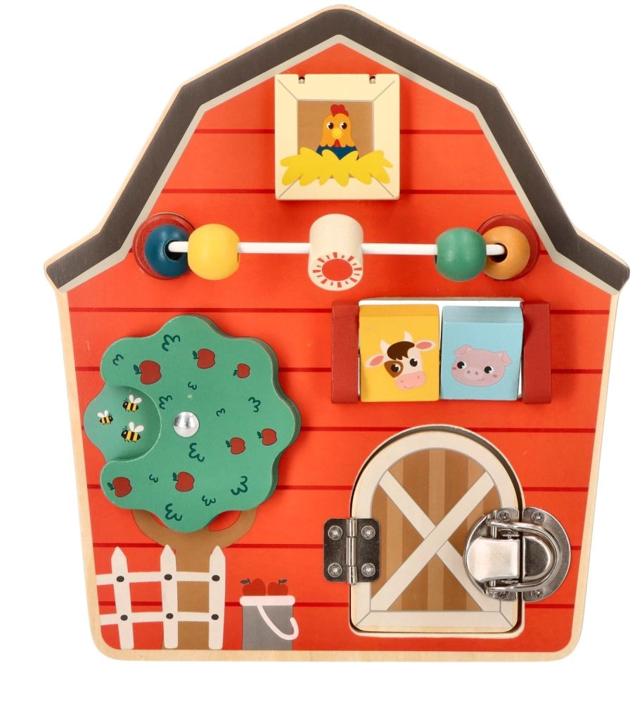 Тази дървена активна табла във формата на плевня е проектирана да насърчава фината моторика и забавлението при децата. С пъстра фермерска тема и цветове не само образова, но и забавлява най-малките членове на семейството. Интерактивни елементи като плъзгащи се мъниста, въртящо се дърво и вратички с резе помагат за развитие на координацията око-ръка.