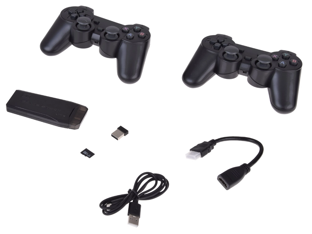 - 2 геймпада, 1 конзола с SD карта, HDMI кабел, USB захранващ кабел, ръководство