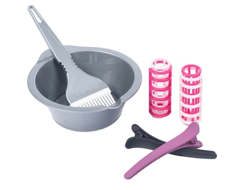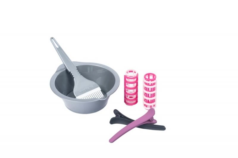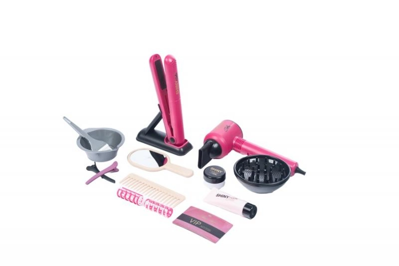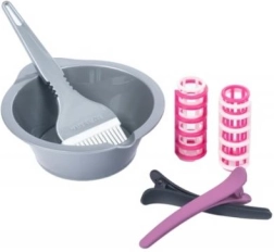 - Пълен набор: сешоар, преса, гребен, огледалце, щипки, ролки, купички и четчица за боя, аксесоари за грижа и др.