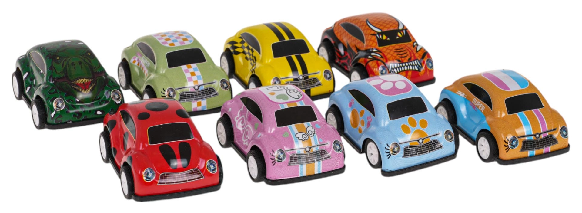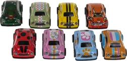 Този пъстър комплект от 8 мини колички съчетава издръжливост, дизайн и лесна употреба. Металният корпус с модерни мотиви и гумените гуми осигуряват дълъг живот и отлична сцепляемост върху гладки повърхности. Механичното задвижване на обратно позволява количките след кратко издърпване да потеглят бързо напред.