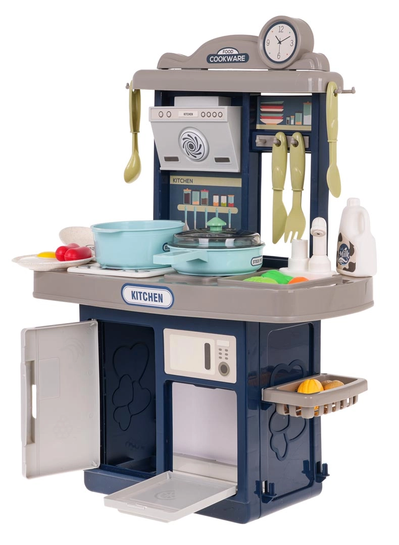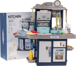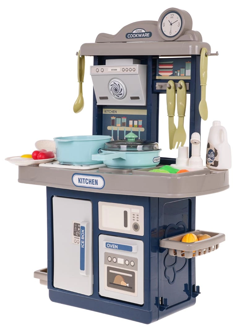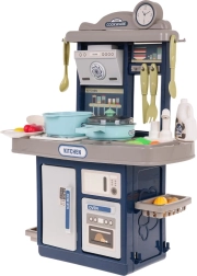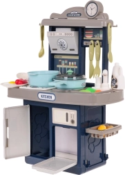 Стилна детска кухничка в син цвят предлага светлинни и звукови ефекти, течаща вода от чешмата и богат комплект от 35 аксесоара за реалистично готвене. Здрава конструкция, интерактивен котлон с подсветка и звуци на пържене и варене, отваряема фурна и хладилник стимулират креативната игра и развитието на въображението при деца от 3 години.