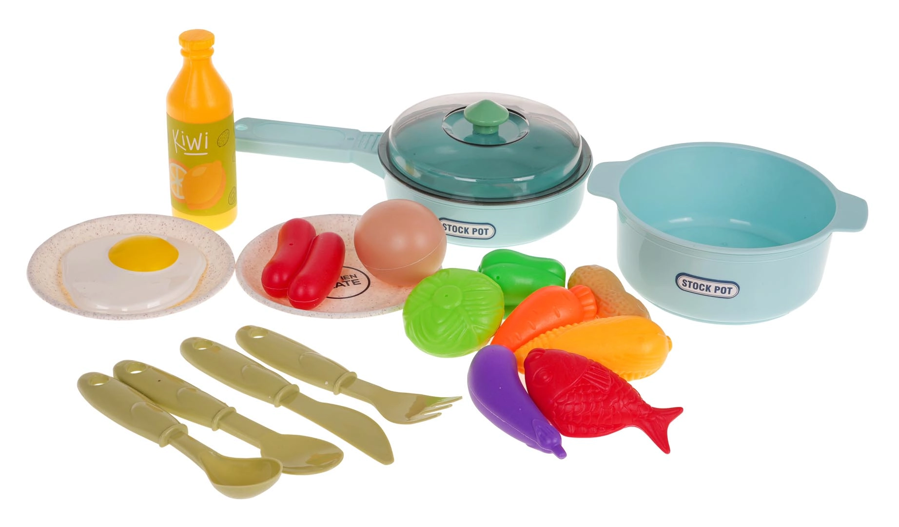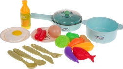 Тенджера, тиган, чинии, прибори и разнообразен набор хранителни аксесоари осигуряват на децата всичко необходимо за игра на готвачи.