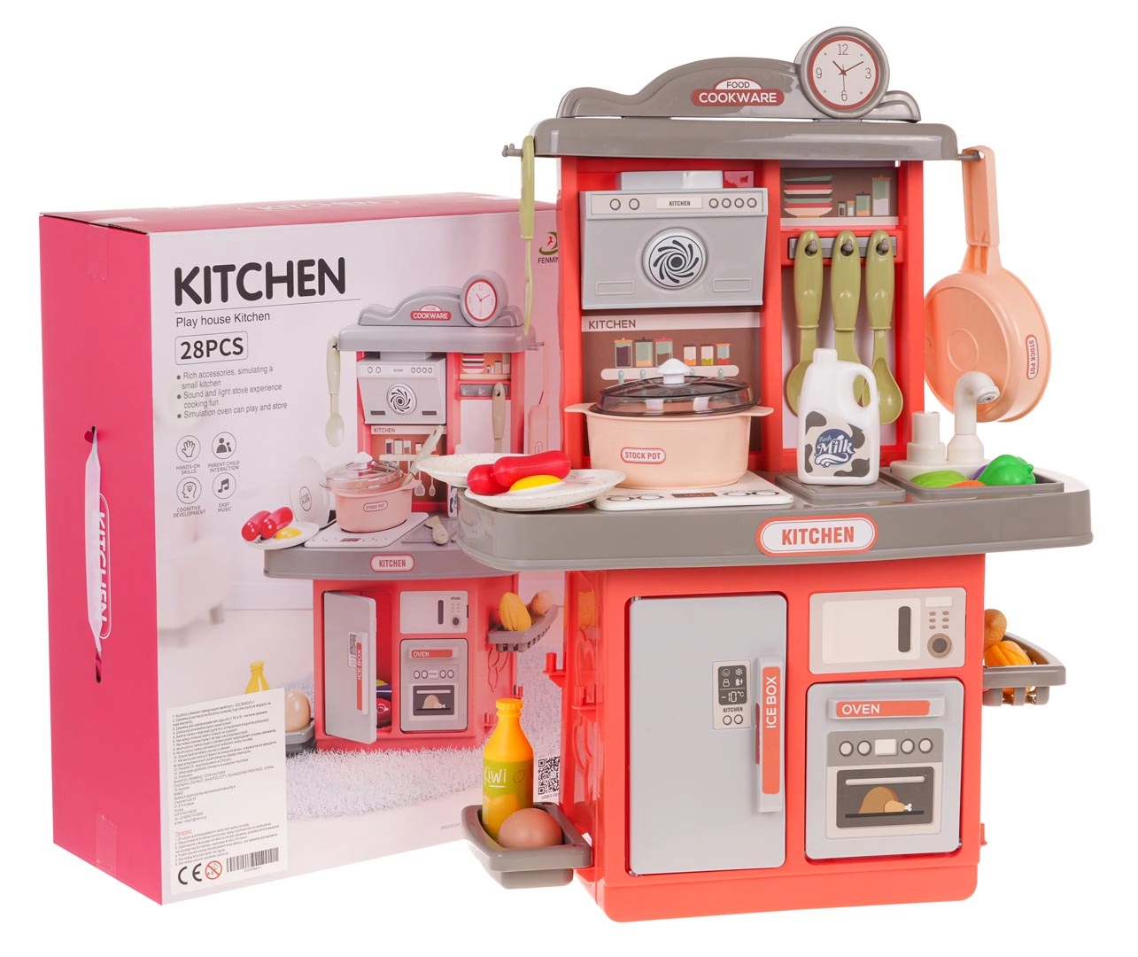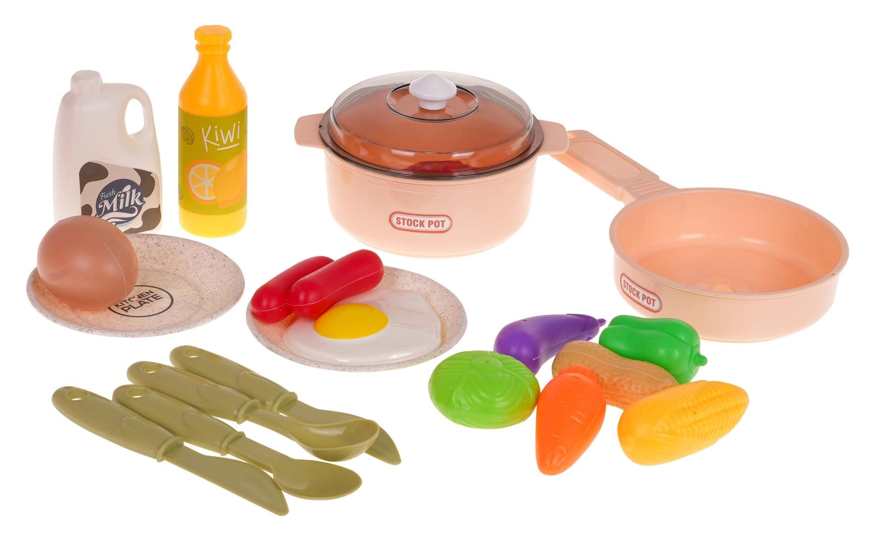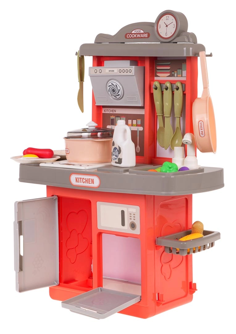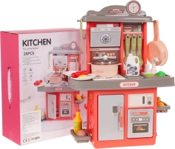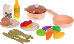 Комплектът от 28 части включва тенджера с капак, тиган, чинии, прибори и широк избор на хранителни продукти. Децата могат да приготвят закуска, обяд и вечеря според въображението си.