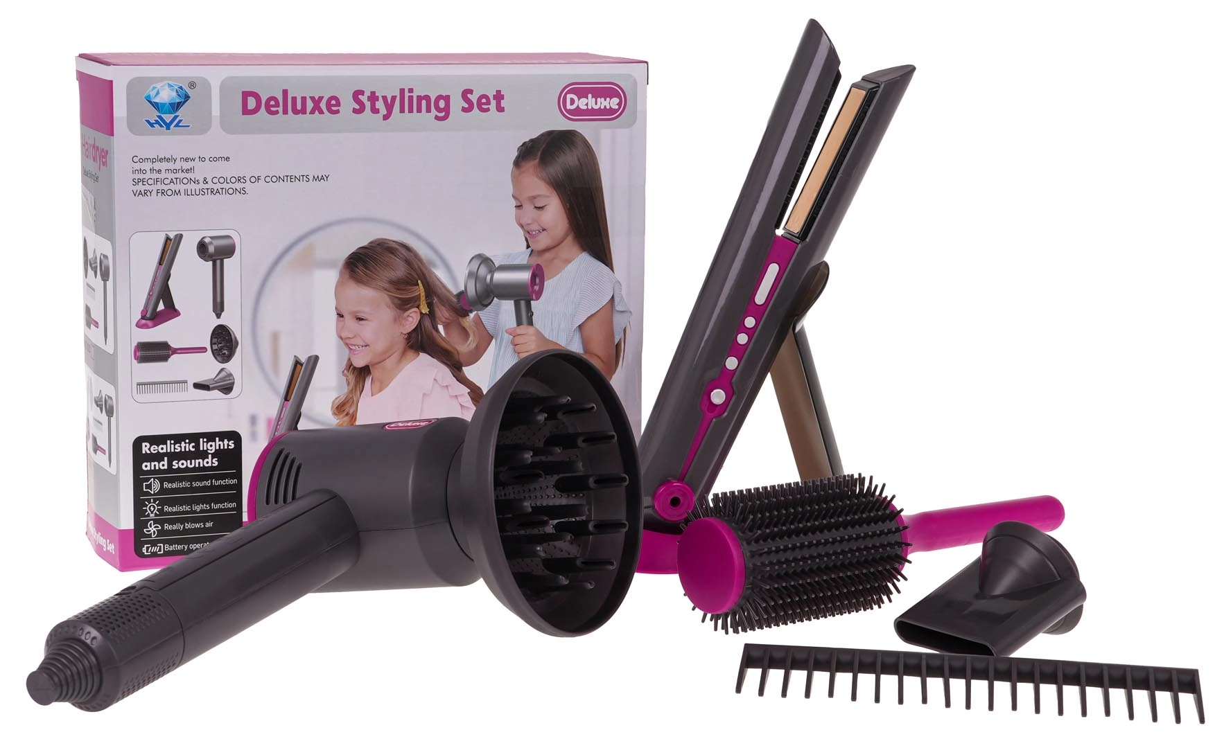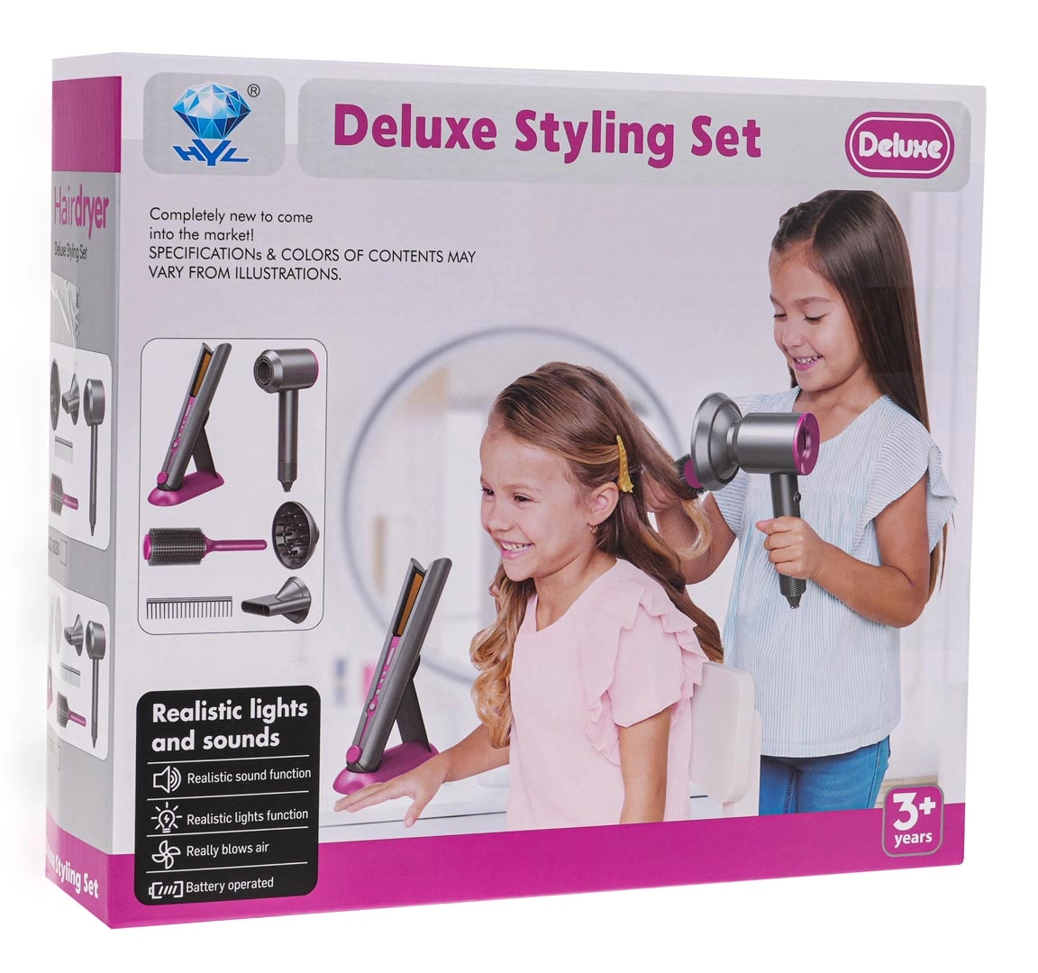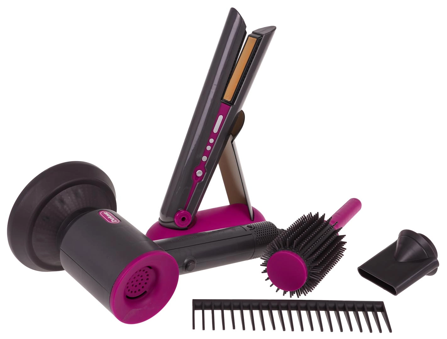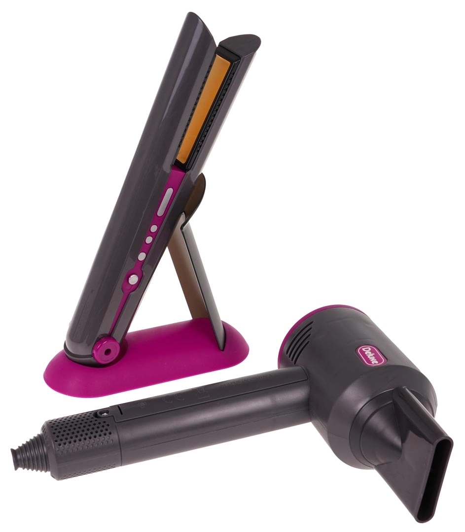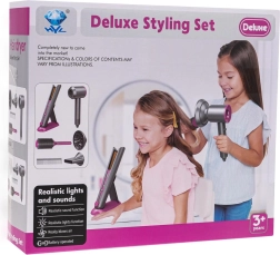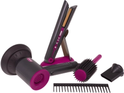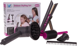 Идеален фризьорски комплект за деца, които искат да станат малки фризьорки. Богато оборудван сет включва сешоар със сменяеми накрайници, преса за коса, гребен и четка. Сешоарът се захранва с две батерии тип AA (не са включени в комплекта) и издава звуци като при истинско сушене. Пресата при включване свети и издава характерни звуци.