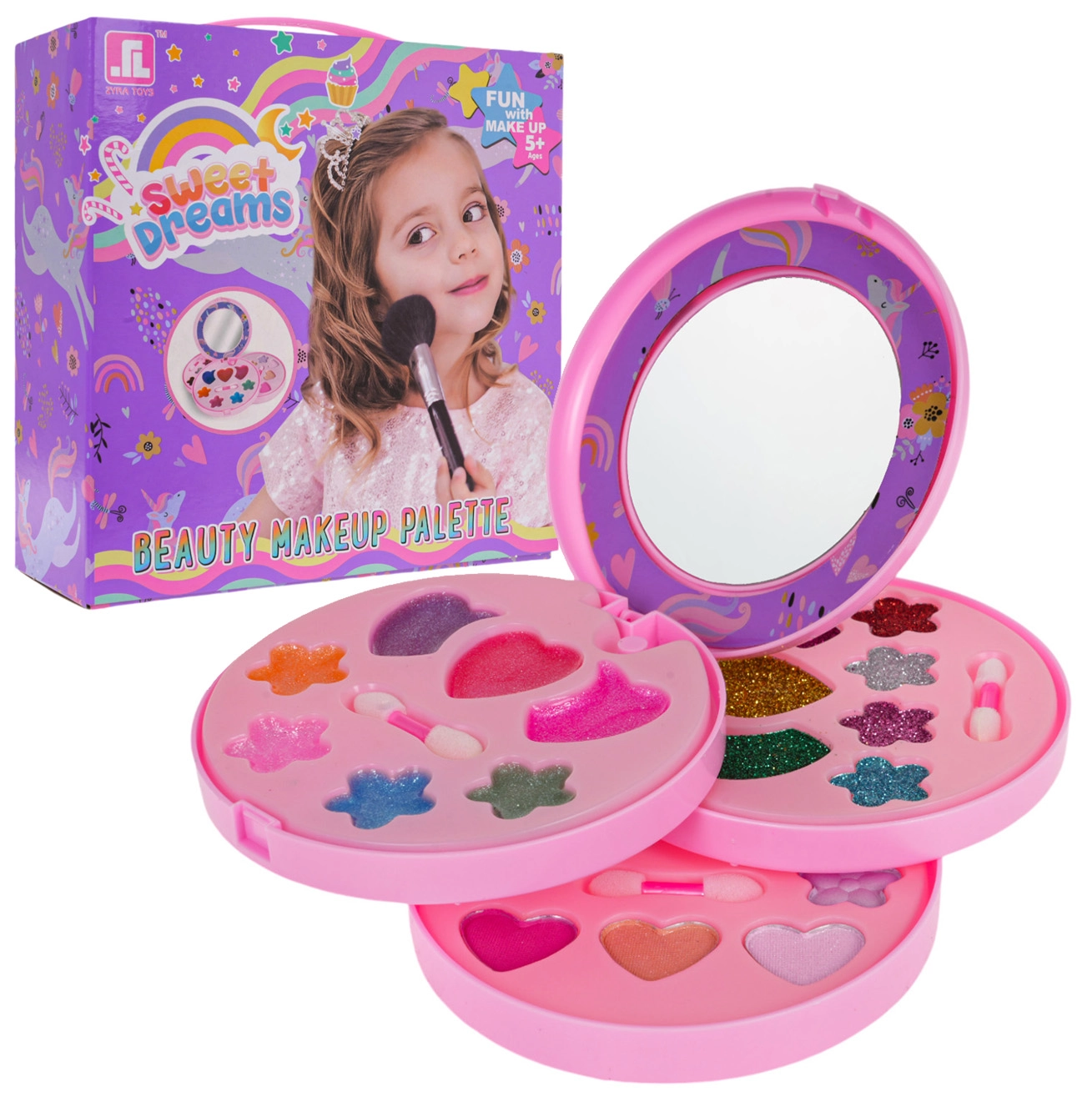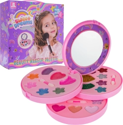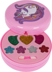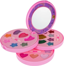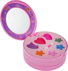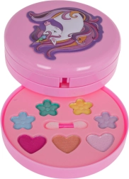 Вълшебен детски комплект за грим с мотив еднорог в разгъваща се шкатулка ще зарадва всяка малка красавица от 5 години. Съдържа пъстра палитра сенки, гланцове и брокати в сладки форми, с практично огледалце и апликатори. Козметиката е безопасна за детската кожа и лесно се отмива, така че забавлението и подредбата са без грижи. Подкрепя креативността и развива усета за цветове и естетика.