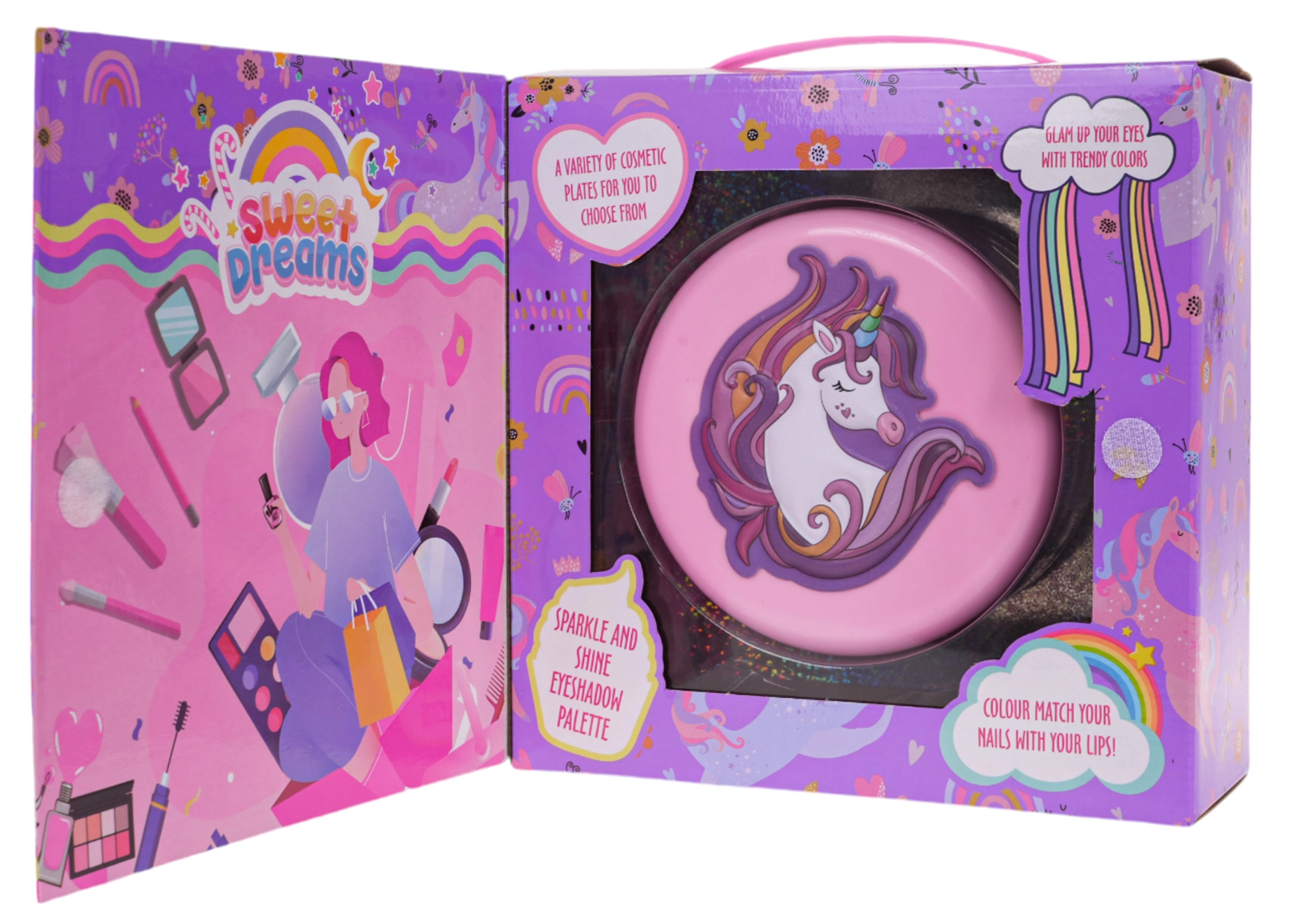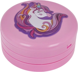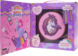 Разгъваща се розова шкатулка с мотив еднорог крие цветен свят на фантазията: цветенца, сърчица и звездички, пълни със сенки, балсами и брокати. Благодарение на вграденото огледалце и приложените апликатори децата могат безопасно и удобно да откриват света на грима.