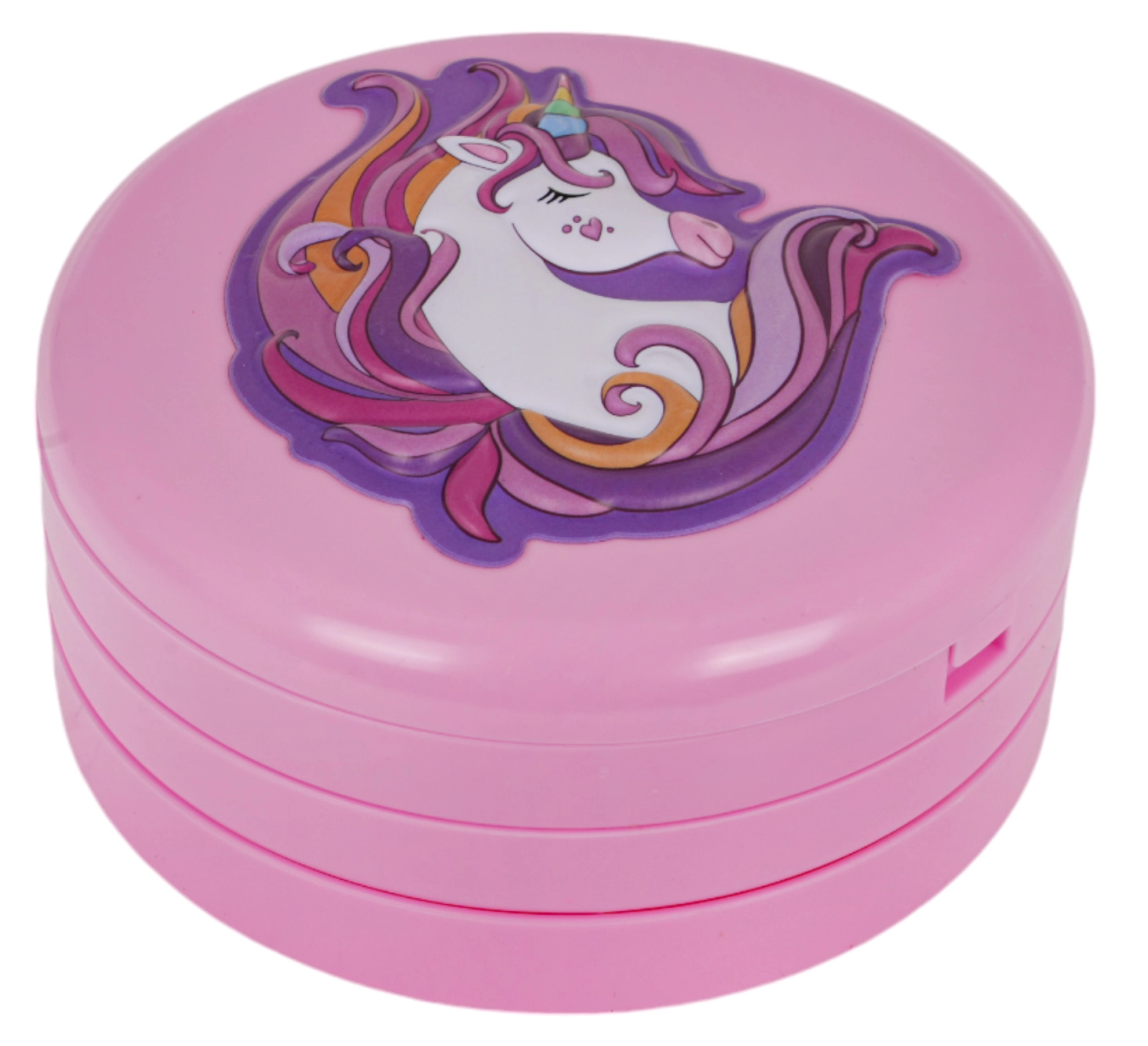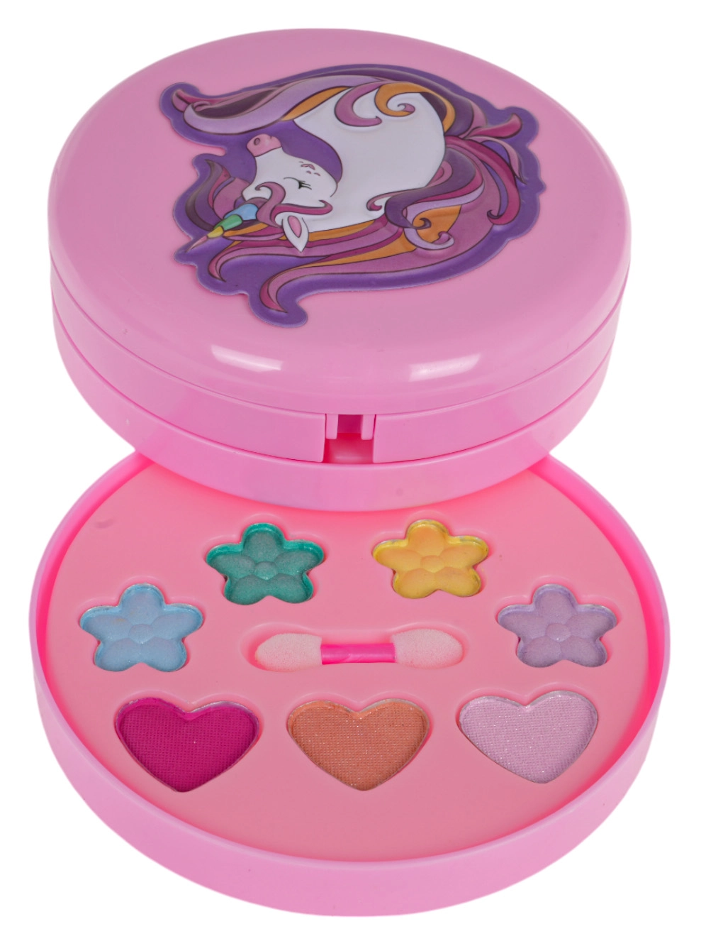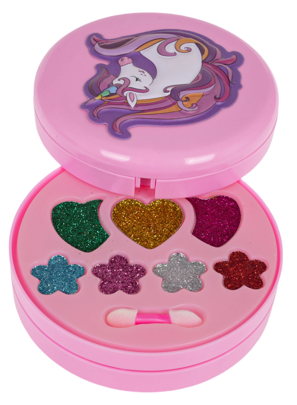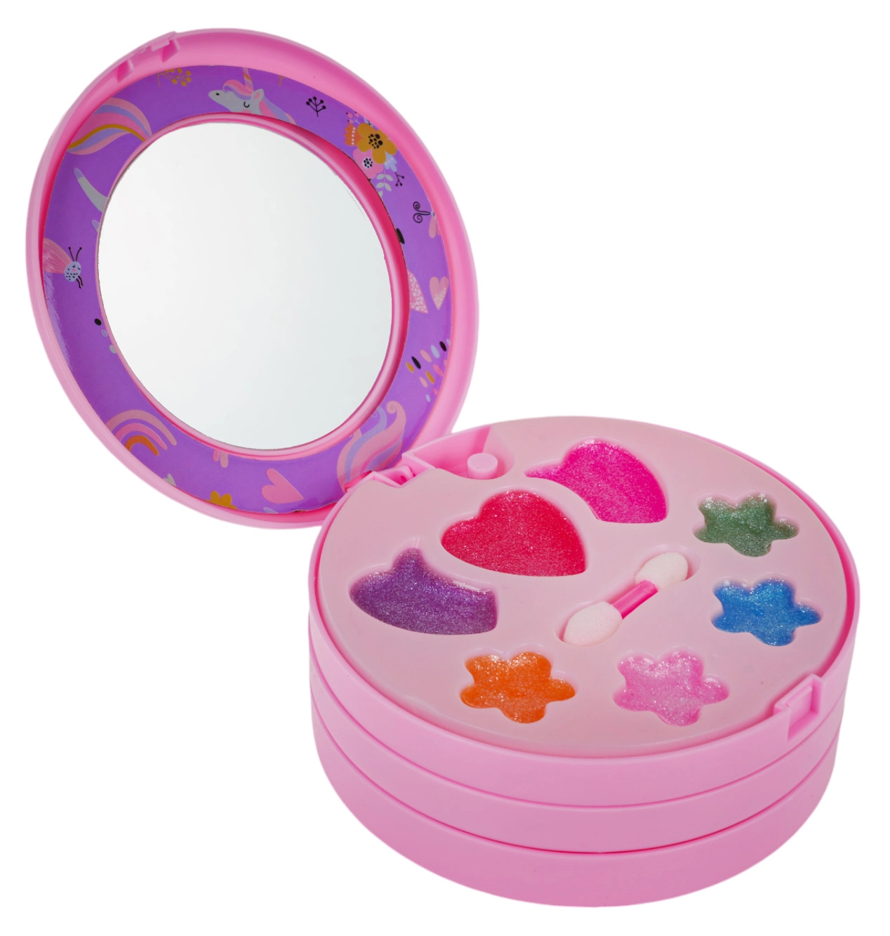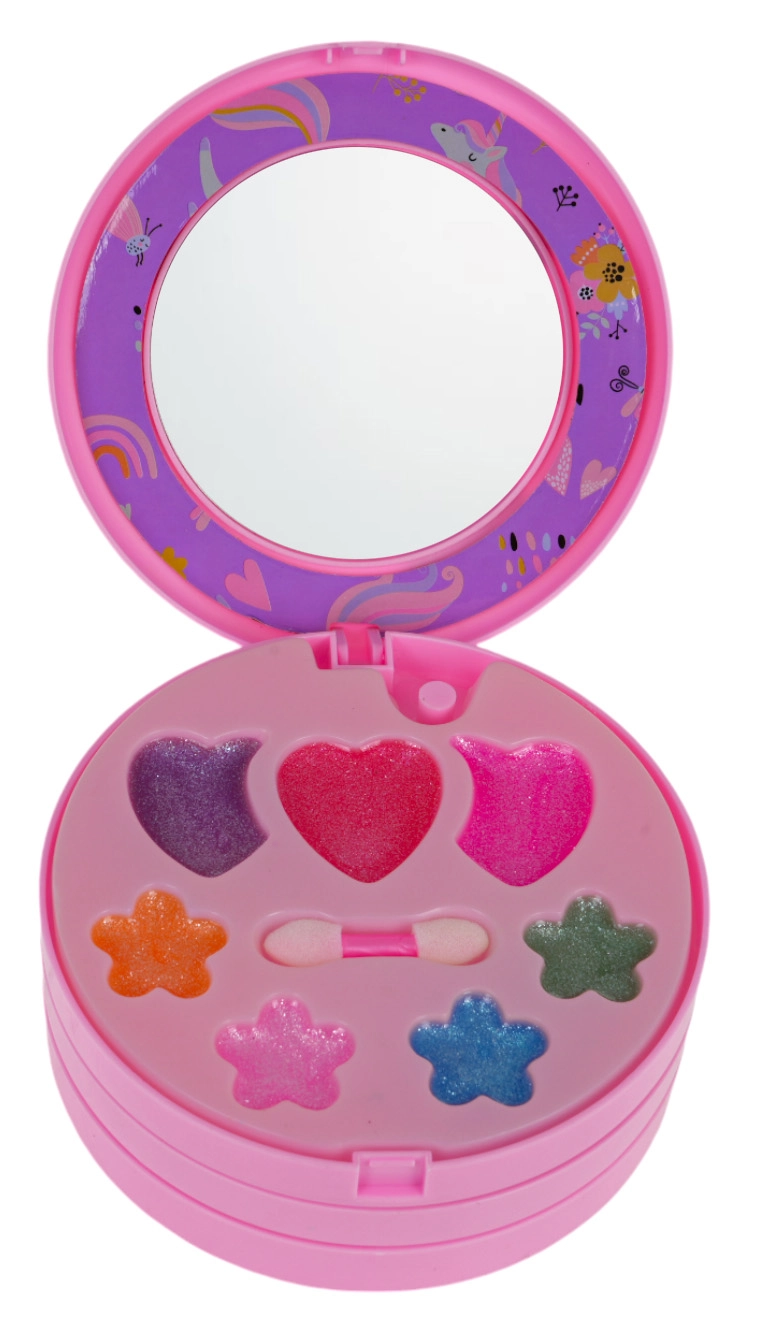 Компактна кръгла кутийка, която се отваря на няколко нива с пъстри цветове и брокати, идеална за пътуване и игра у дома.