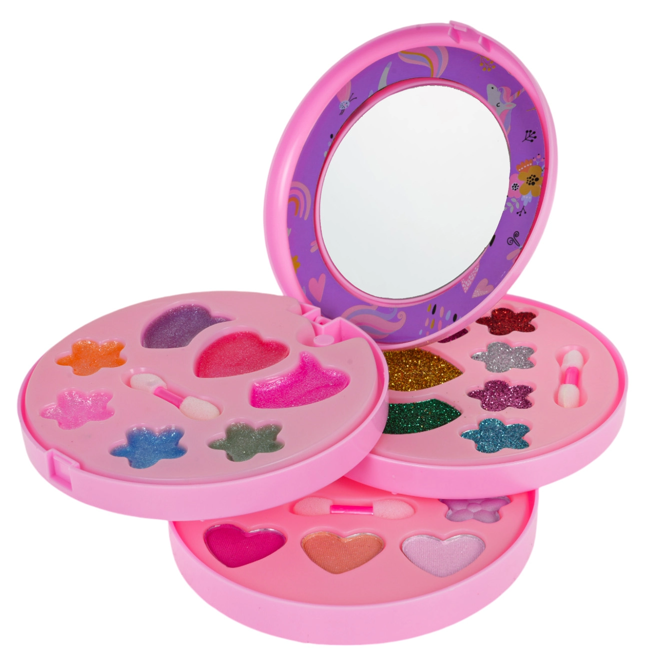 Включени са огледалце и двустранни апликатори, за да могат децата удобно да нанасят сенки, гланцове и брокати.