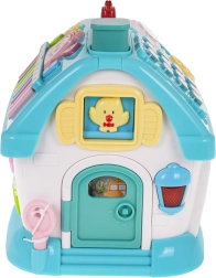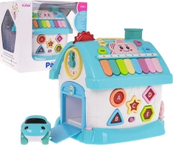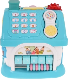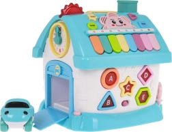 Интерактивната къщичка е изработена от качествен пластмасов материал в атрактивни цветове и е създадена така, че децата по забавен начин да развиват разпознаване на форми, букви и числа. Всяка от четирите стени предлага различни активности – от часовник с истински подвижни стрелки и гаражни врати, през стена с азбука и подсветнати форми, до входна врата с ключ със светлини и звуци. В комплекта има и малка количка за още повече игрови сценарии.