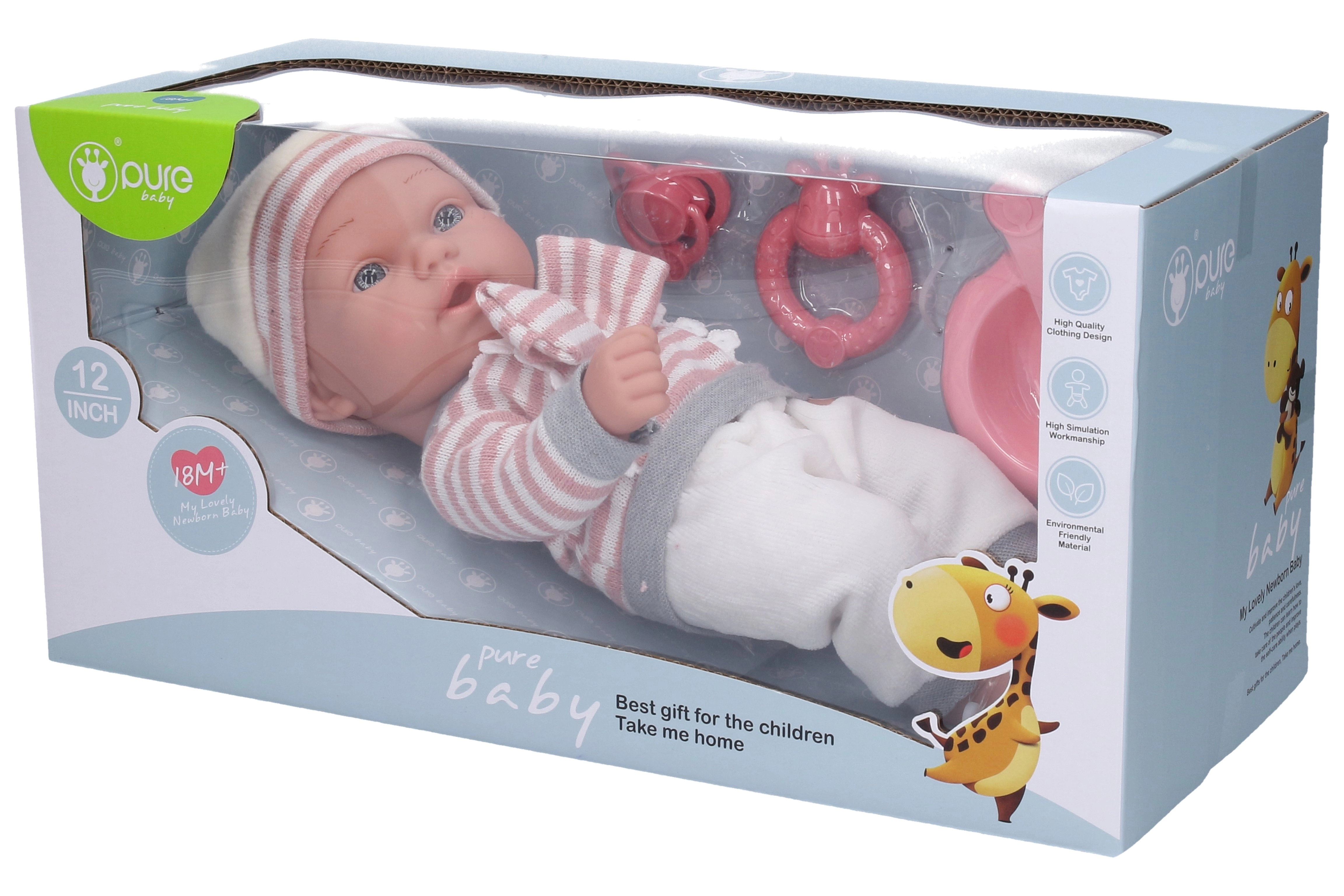 Оставете вашето дете да създава собствени истории, докато играе с тази прекрасна кукла. Благодарение на реалистичния ѝ размер от 30 см, тя е лесна за боравене дори и за по-малки деца. Аксесоари като биберон, дрънкалка и купа с прибори не само обогатяват играта, но и помагат на децата да развиват моторните си умения.