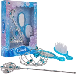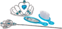 Очарователен комплект за малки принцеси от 3 години, който ще зарадва всяка любителка на приказки. Включва тиара, вълшебна пръчица, огледалце и четка за коса с нежна синя украса. Безопасно изпълнение, качествени материали и вълшебни блестящи детайли стимулират фантазията и ролевите игри.