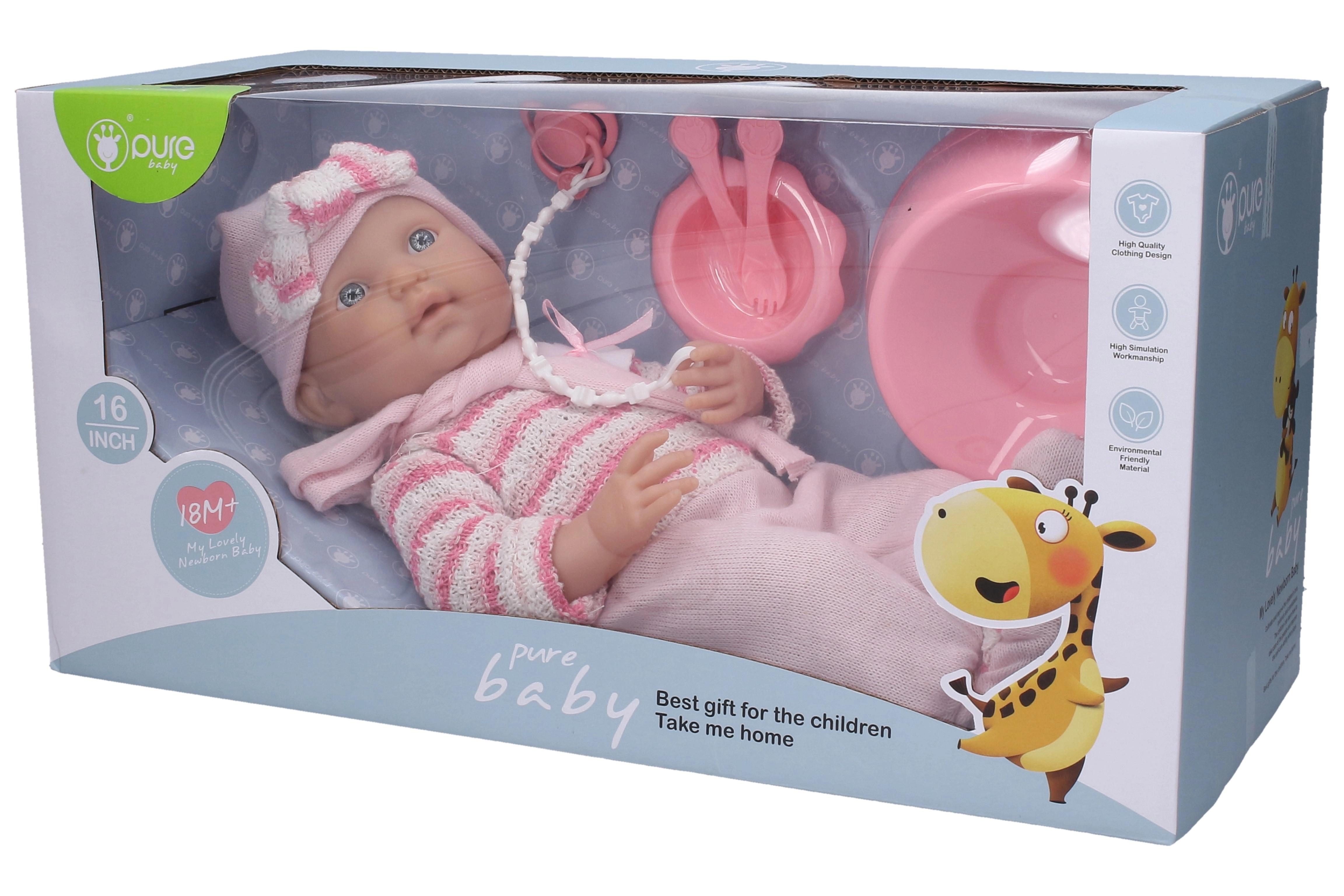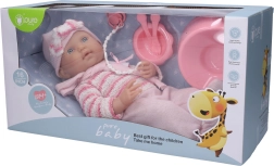 Сладко бебе в мек розов гащеризон ще зарадва всяка малка майка. Куклата с размер 40 см е идеална за игра и грижи и идва с практични аксесоари: гърне, купа, прибори и биберон за по-реалистично изживяване по време на игра.
