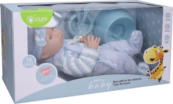Това реалистично бебе в мек син гащеризон е чудесен спътник за ежедневна игра. Благодарение на размера 40 см се държи удобно от децата и лесно се облича и приспива. Комплектът съдържа всичко необходимо за пълни ритуали по грижа и хранене.