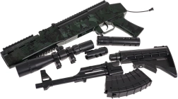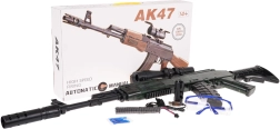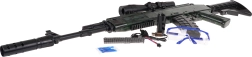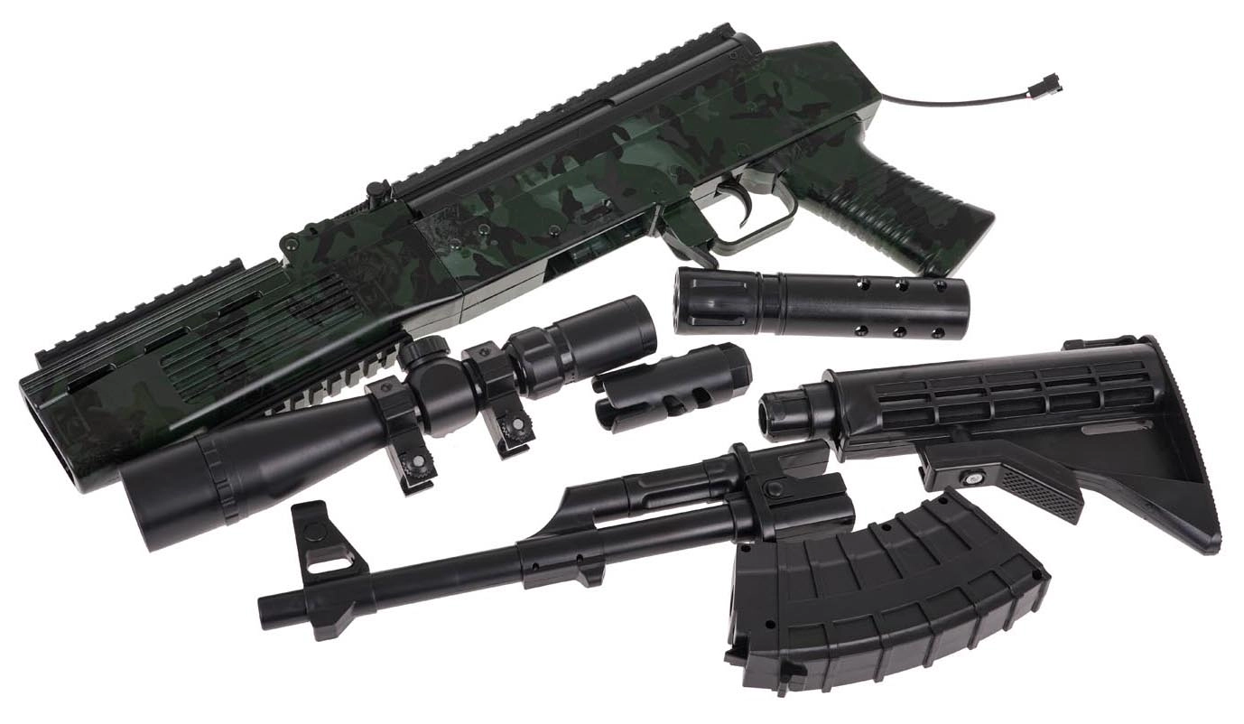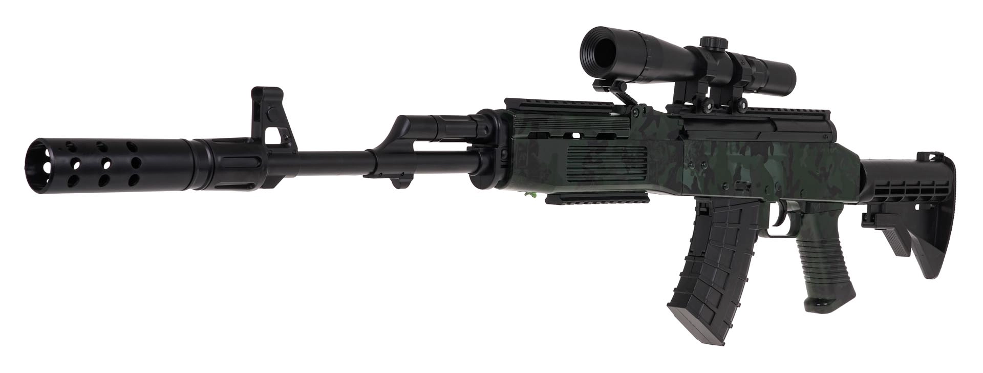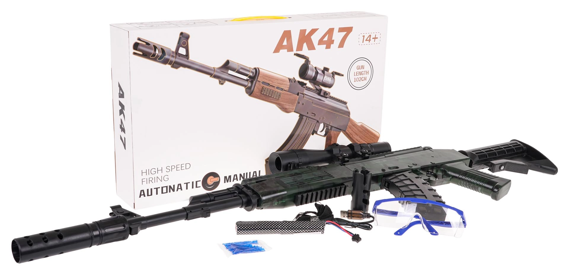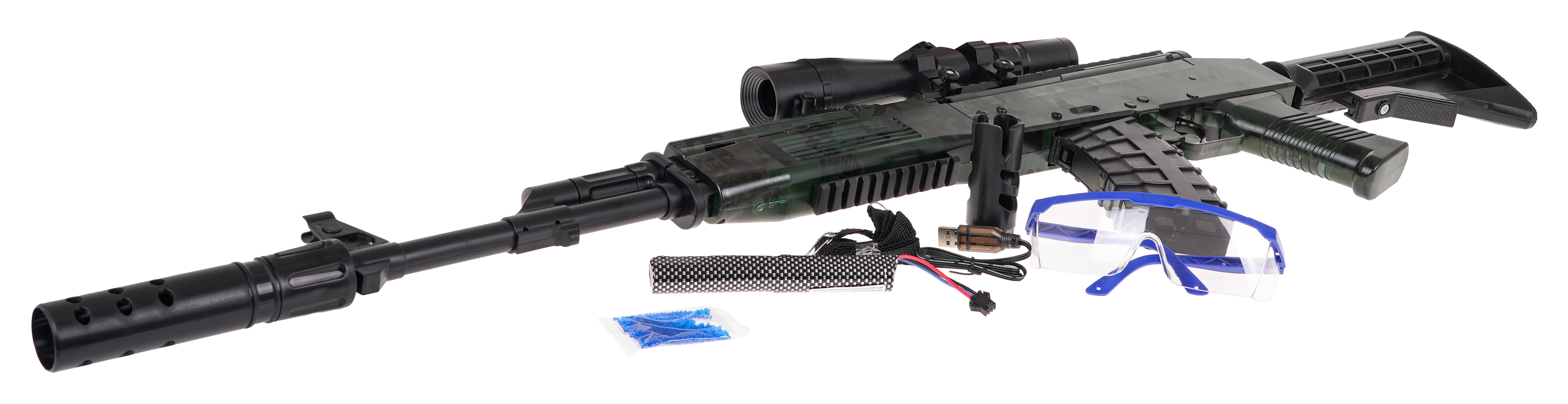Като муниции се използват хидрогелови топчета (препоръчителен диаметър около 7–8 mm), които преди употреба се накисват във вода за 4–6 часа. След набъбване излейте водата и сте готови за игра. Топчетата при удар безопасно се пукат, което ги прави подходящи за развлекателна употреба. В опаковката ще намерите богат набор от аксесоари: цев, заглушител, пълнител, приклад, прицел, както и акумулатор 7,4 V с USB зареждане и защитни очила.