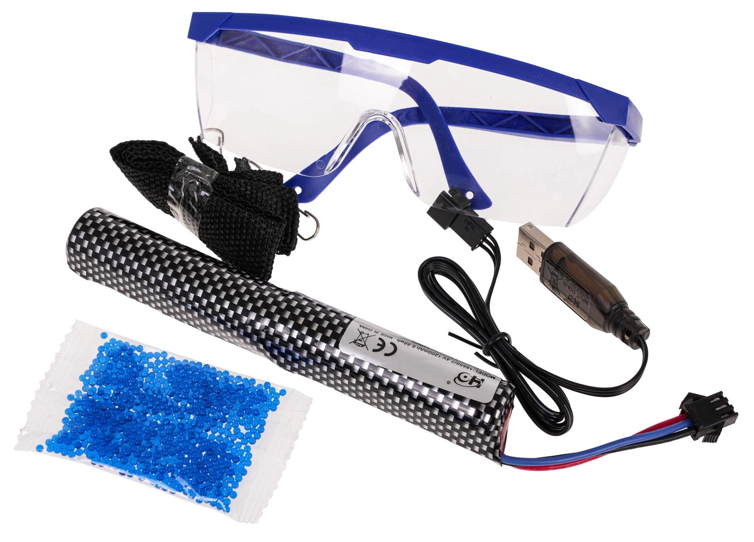 Хидрогеловите топчета се пукат при попадение и са подходящи за развлекателна употреба. В комплекта ще намерите и защитни очила, акумулатор 7,4 V и USB кабел.