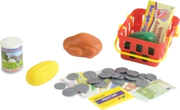 Комплектът съдържа всичко необходимо за обслужване на въображаем магазин, включително кошница с аксесоари, играчни пари и платежна карта. Децата могат да упражняват практическо смятане директно на касата, което подпомага техните математически умения и креативност.