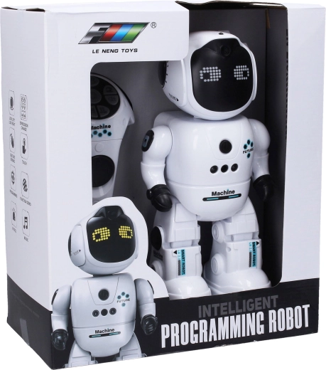 Роботът предлага режим за програмиране, демо показвания, звук и музика с настройка на силата на звука. Управлението е интуитивно – достатъчен е жест, допир или натискане на бутоните. Бутонът ON/OFF е удобно разположен на гърдите му. Зареждането става чрез USB кабел (включен в комплекта), а в дистанционното се поставят 2× AAA батерии (не са включени).