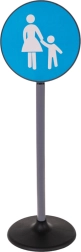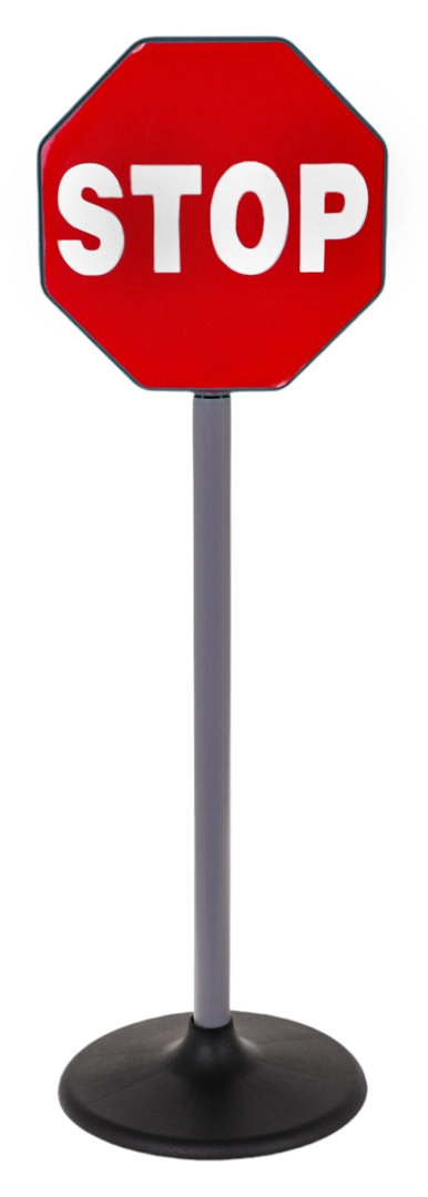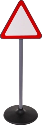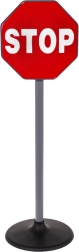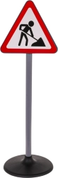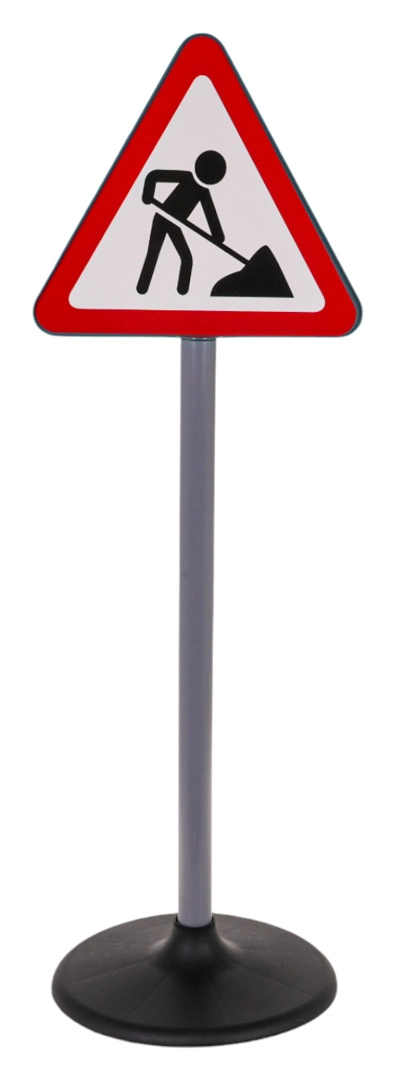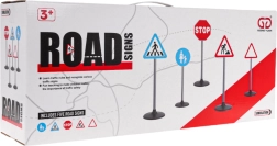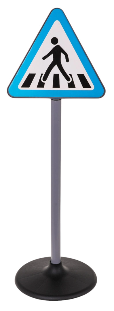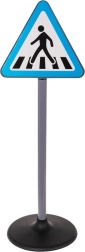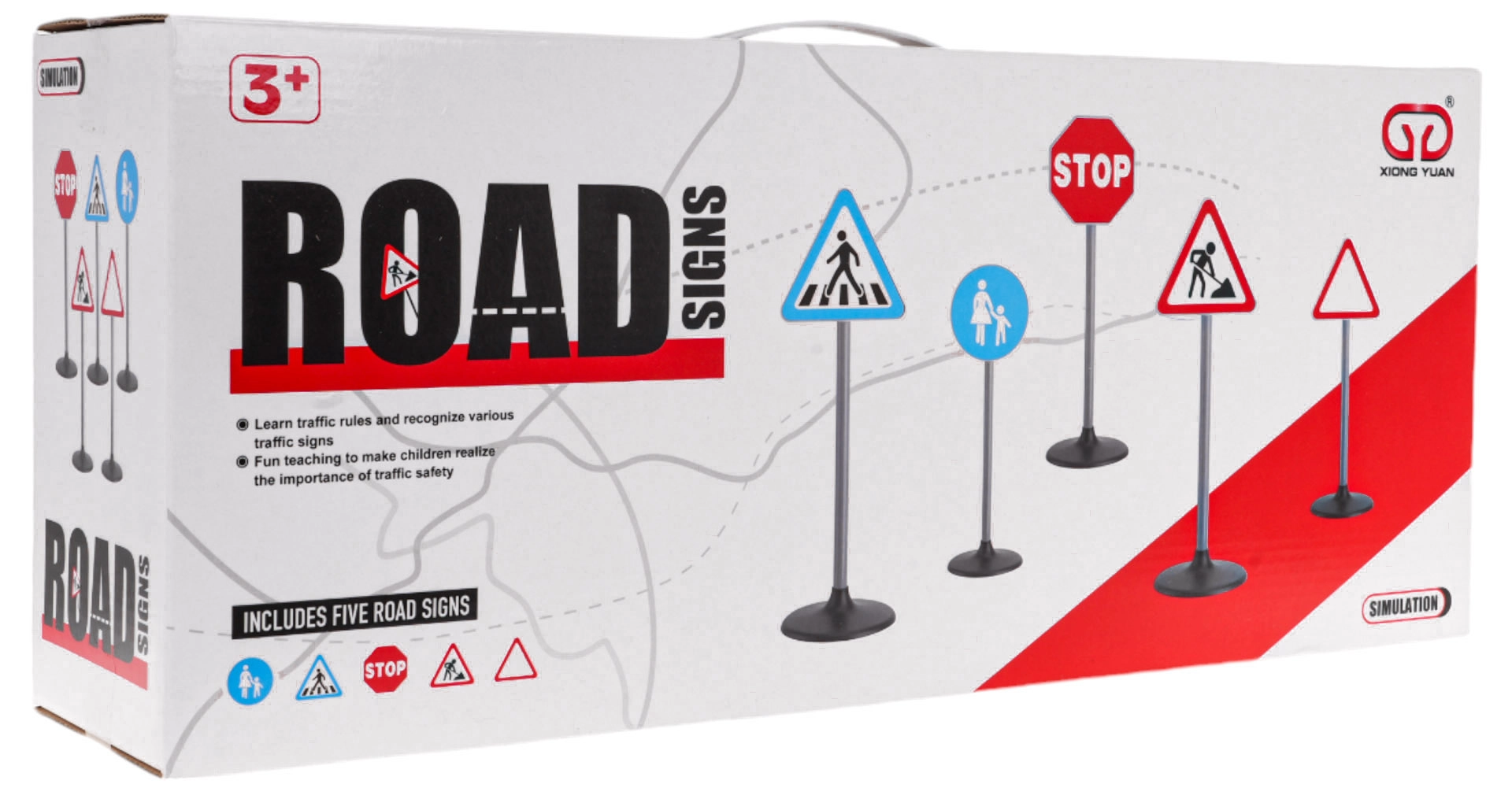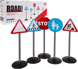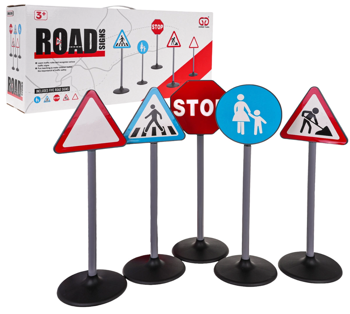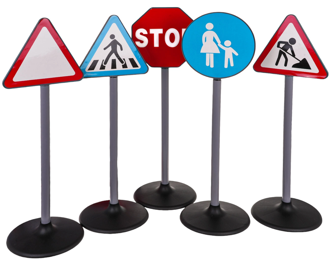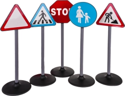 Този комплект пътни знаци включва пет различни знака: стоп, пешеходна пътека, предупредителен триъгълник, пътни работи и тротоар. Изработени са от качествена пластмаса и реалистично оформени с внимание към детайлите. Те са размерно съобразени с височината на детето, което ги прави идеална образователна играчка за най-малките.